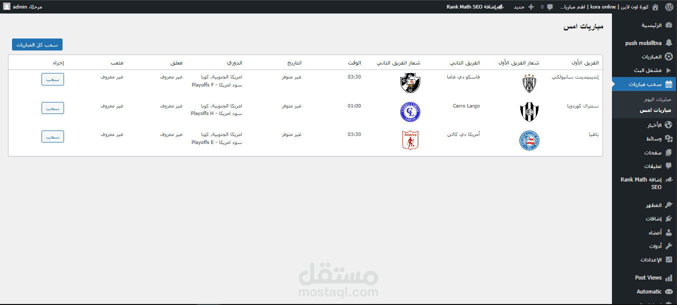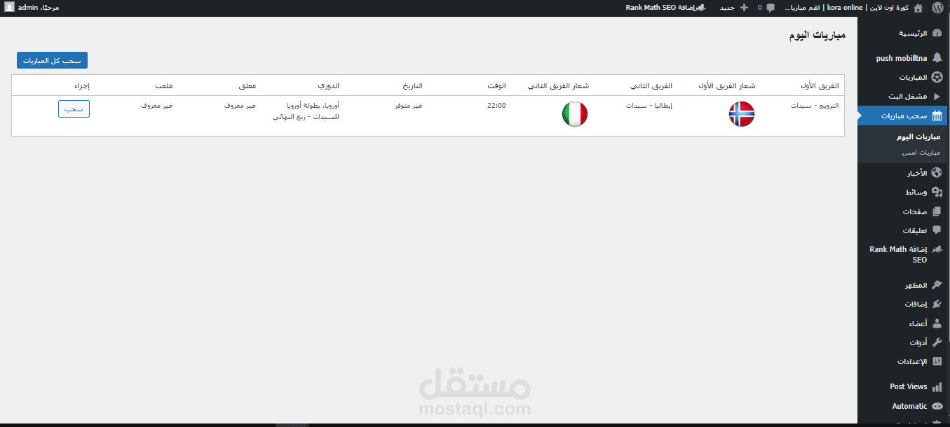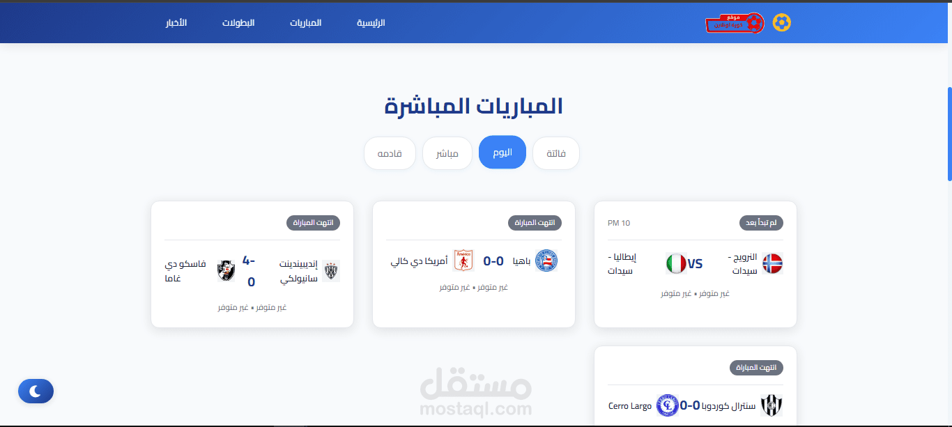 عرض جدول المباريات (اليوم – الغد – القادمة – المنتهية).
