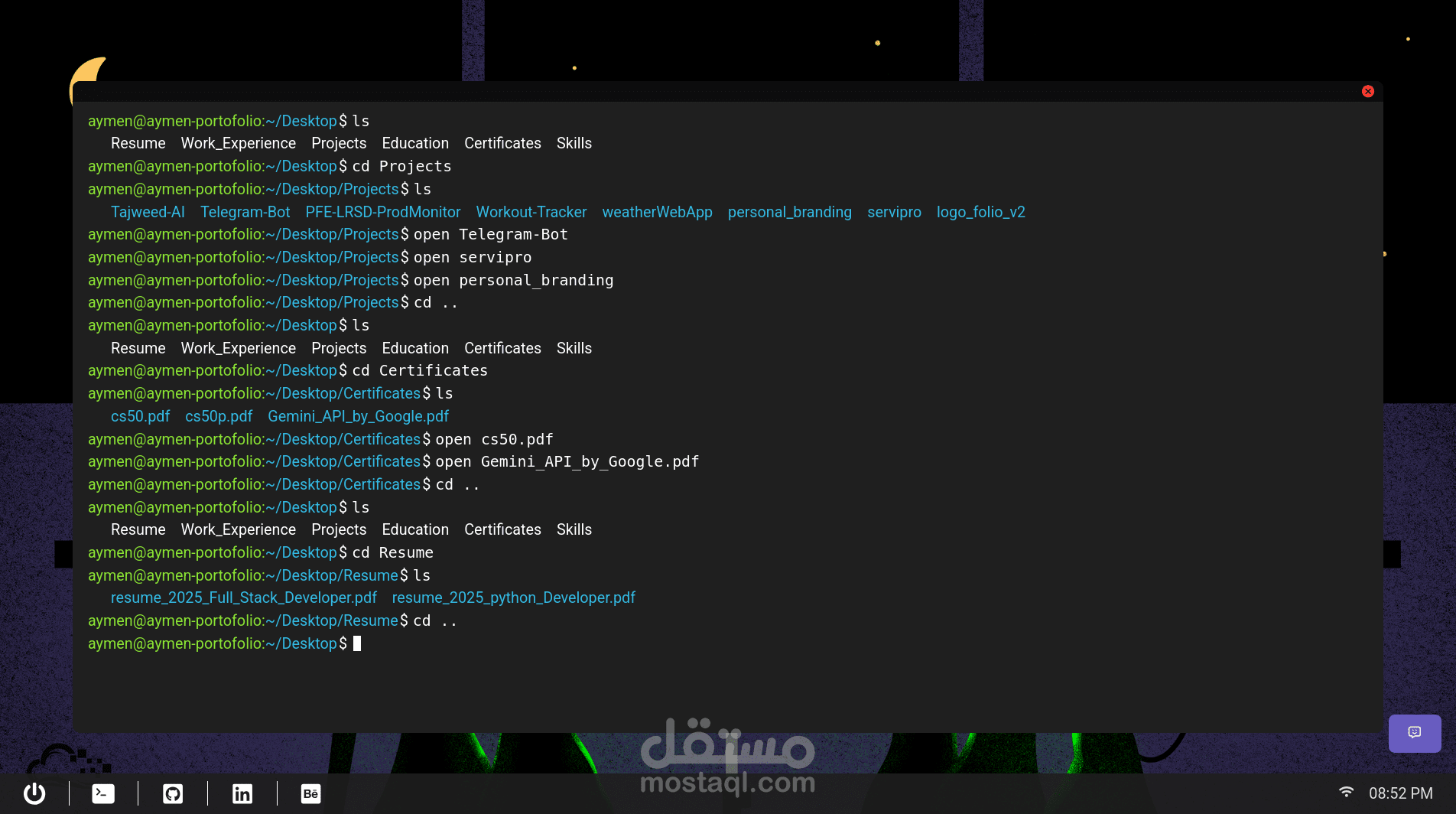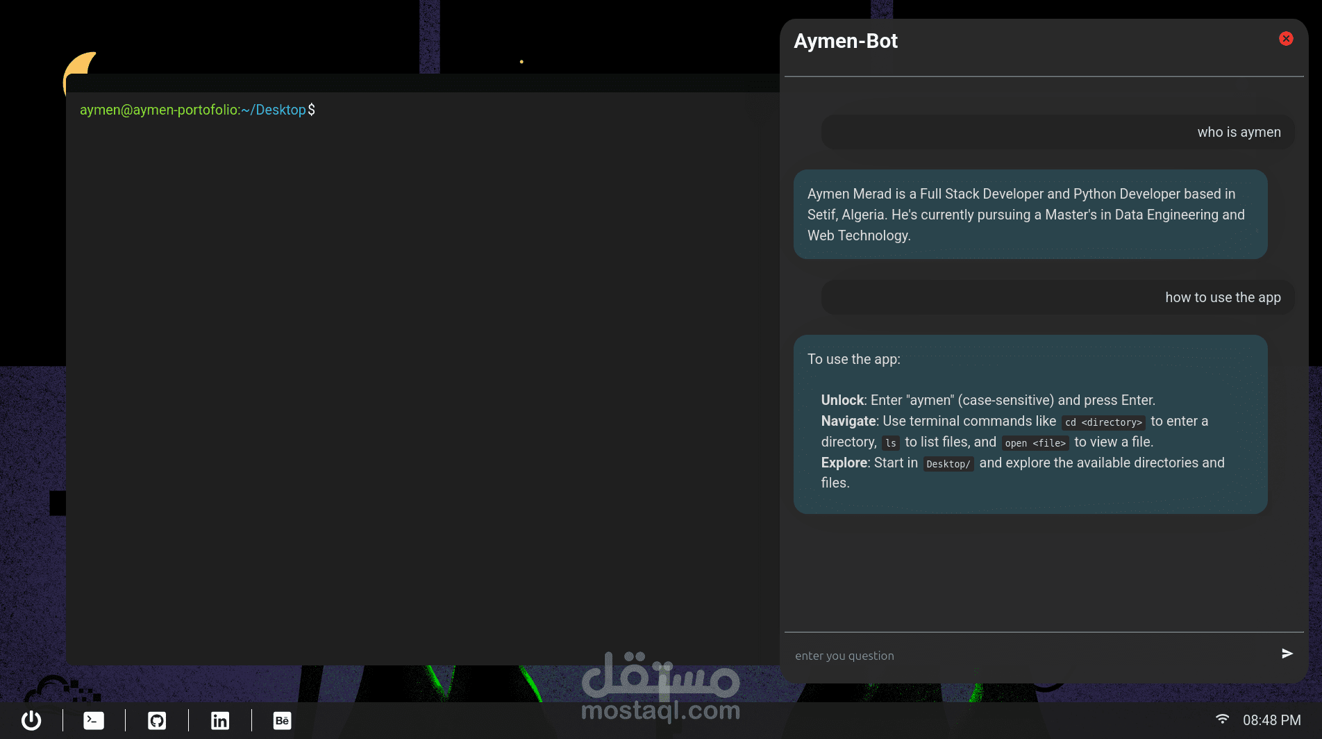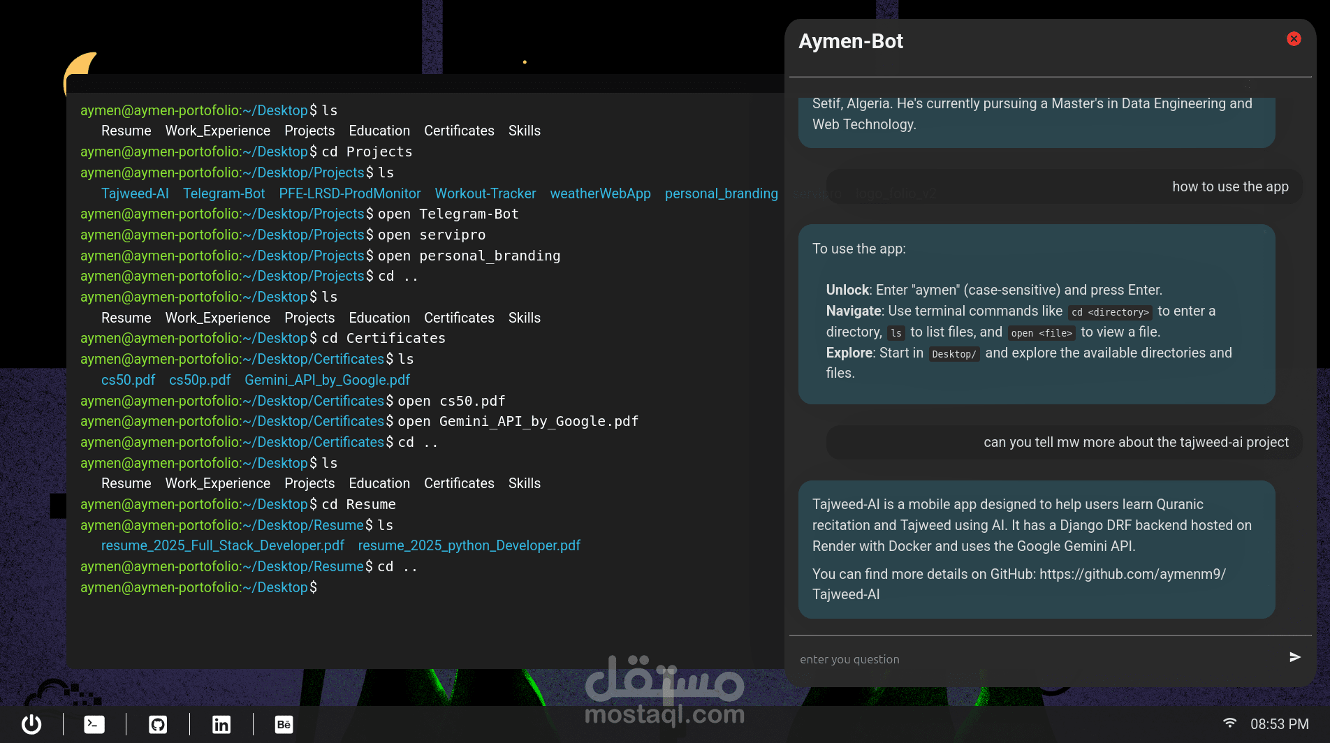 A portfolio web app styled as a very minimal desktop environment, inspired by Linux. It features a taskbar with links, terminal window where users can explore the portfolio using basic commands (cd, ls, open). Content like projects, resume, and skills are shown using PDFs, images, or Markdownm and chatgpt powered by gemini api.