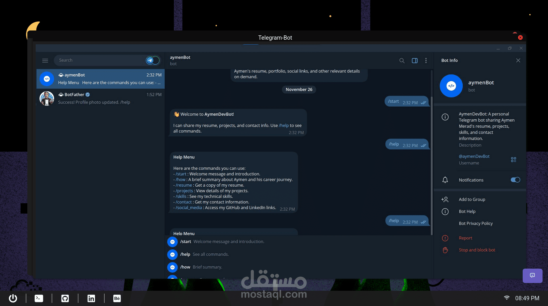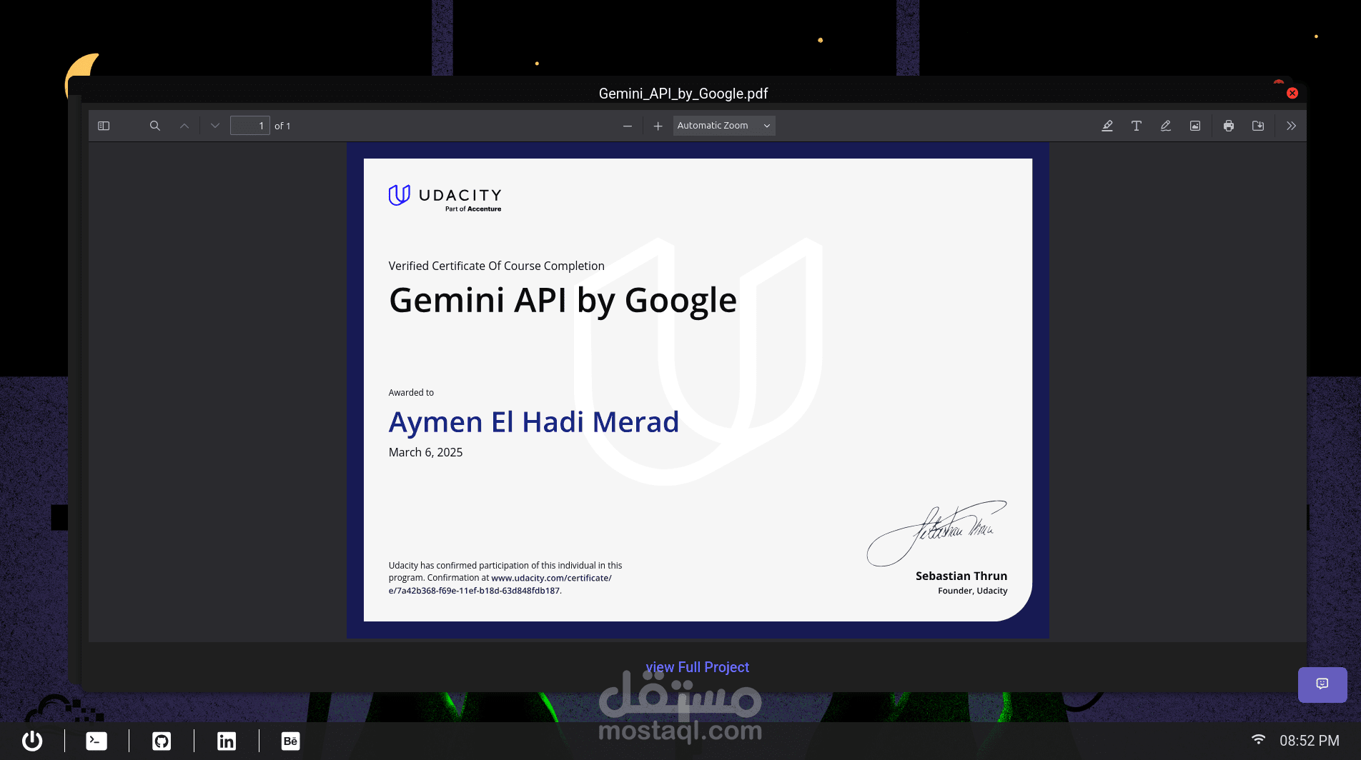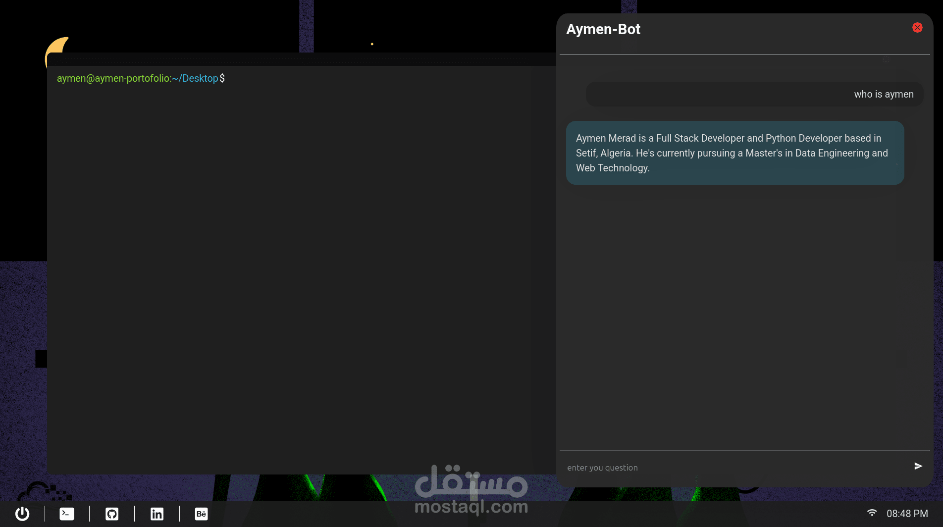 A portfolio web app styled as a very minimal desktop environment, inspired by Linux. It features a taskbar with links, terminal window where users can explore the portfolio using basic commands (cd, ls, open). Content like projects, resume, and skills are shown using PDFs, images, or Markdownm and chatgpt powered by gemini api.