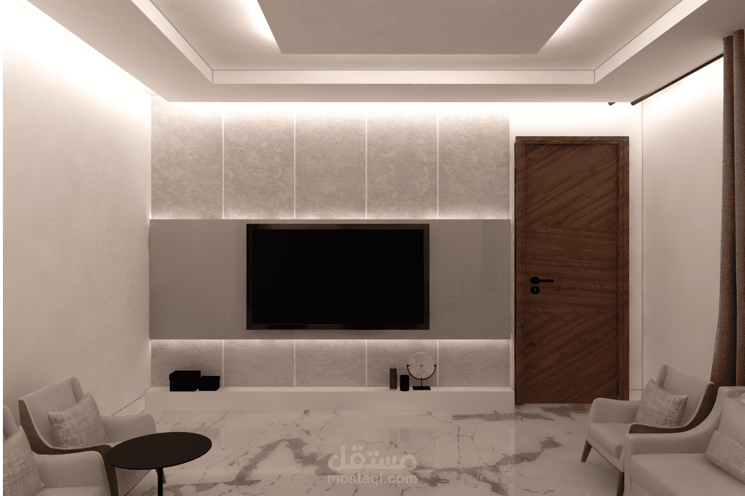 في المساحة التلفزيونية، تم تصميم الحائط باستخدام ألواح مضاءة بإضاءة غير مباشرة، مع لمسة من الخامات العاكسة التي تضيف بعدًا بصريًا وتُبرز وحدة التلفاز كعنصر محوري.
