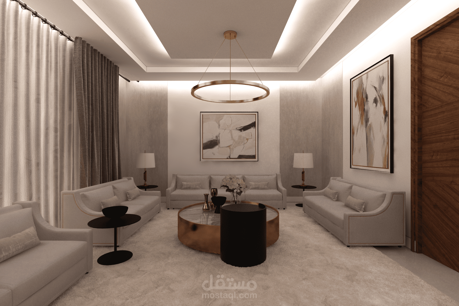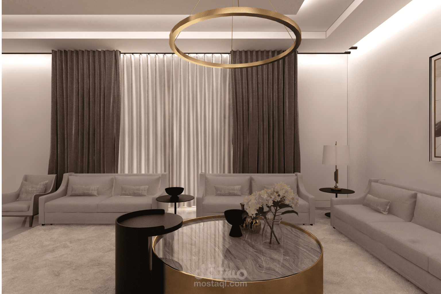 في غرفة الجلوس، تم توزيع الأرائك بشكل متقابل لخلق توازن في التفاعل البصري والحركة، مع طاولة وسطية دائرية بتشطيب معدني ذهبي ولمسة رخامية أنيقة تعكس الفخامة. أما الطاولات الجانبية السوداء فتضفي عنصرًا بصريًا معاصرًا يعزز التباين اللوني.