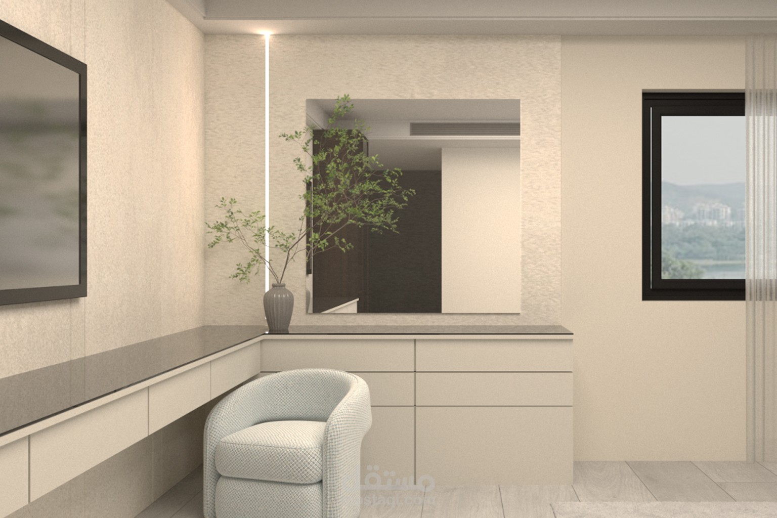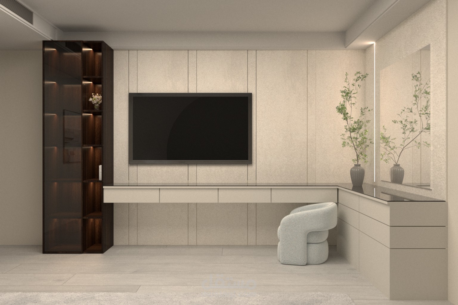 كما تتكامل وحدة التسريحة مع المرايا والأدراج مع جدار التلفاز لتخدم الوظيفة اليومية دون التأثير على بساطة التصميم، مع إضافة لمسات نباتية بسيطة تزيد من الحيوية وتوازن العناصر.