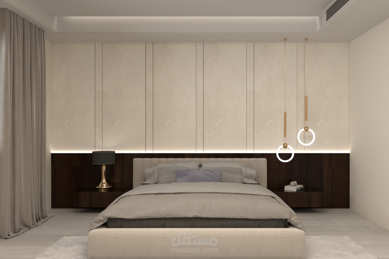 تم تصميم غرفة النوم بأسلوب عصري يراعي الراحة النفسية والهدوء البصري، مع دمج العناصر الجمالية والوظيفية في مساحة واحدة تعكس الذوق الرفيع.