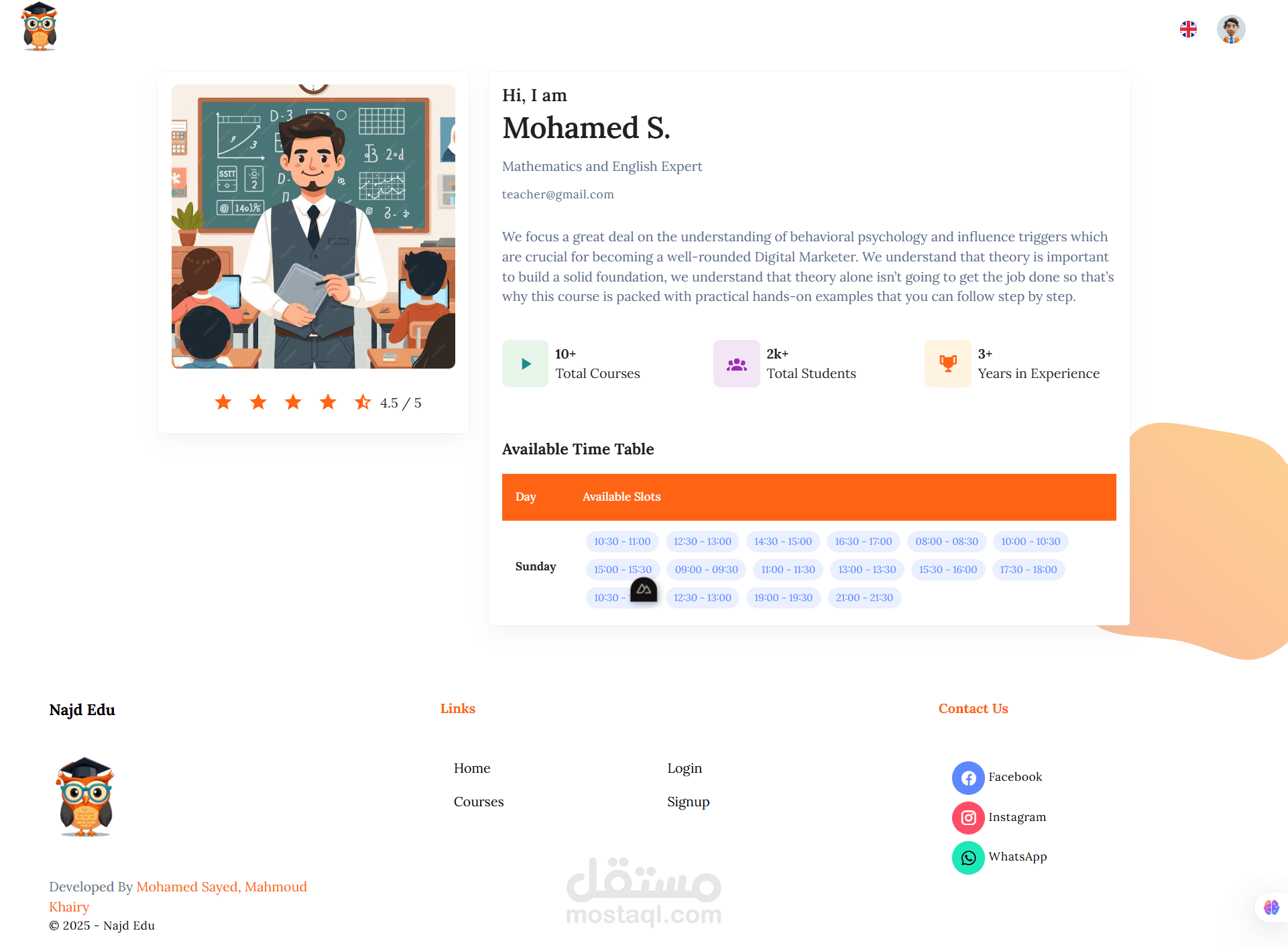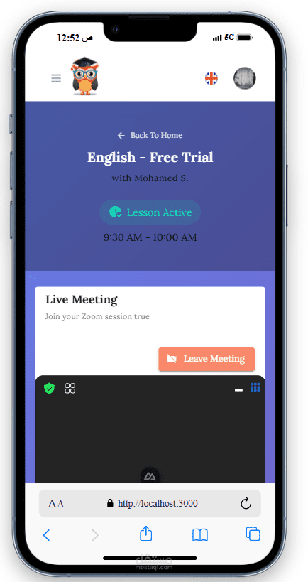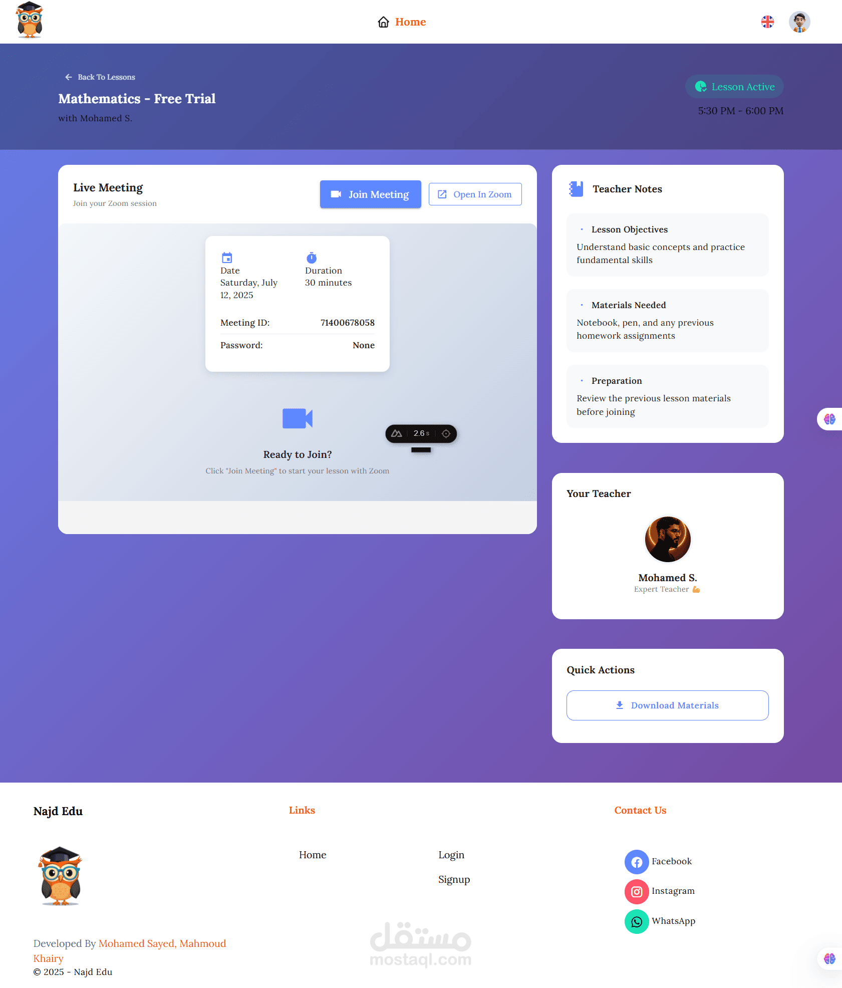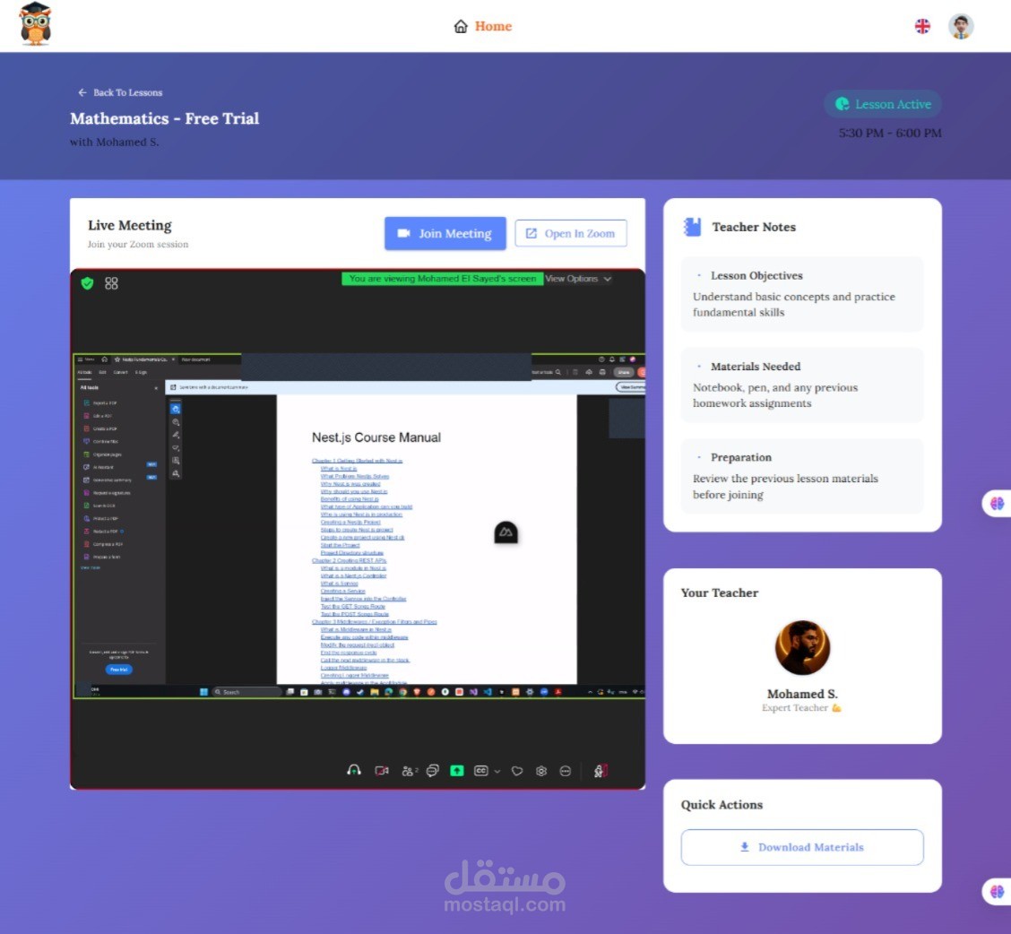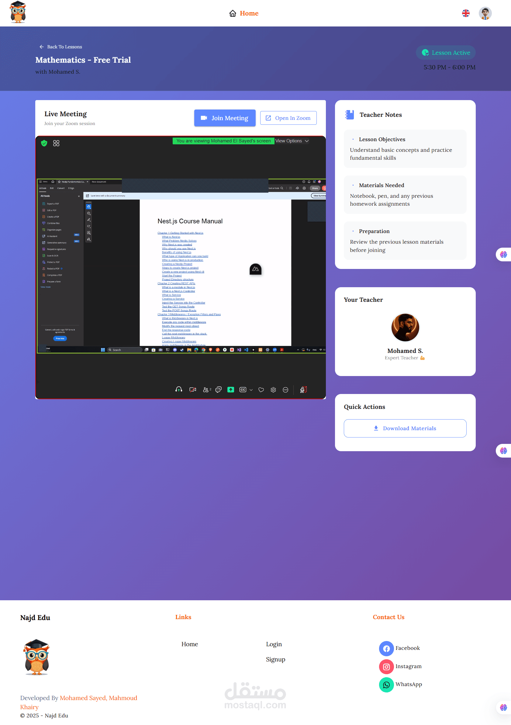 - صفحة الدرس: تتضمن Live meeting و معلومات عن المدرس و الملاحظات التى يكتبها المدرس اثناء الدرس و بعد الدرس امكانية تقييم المدرس