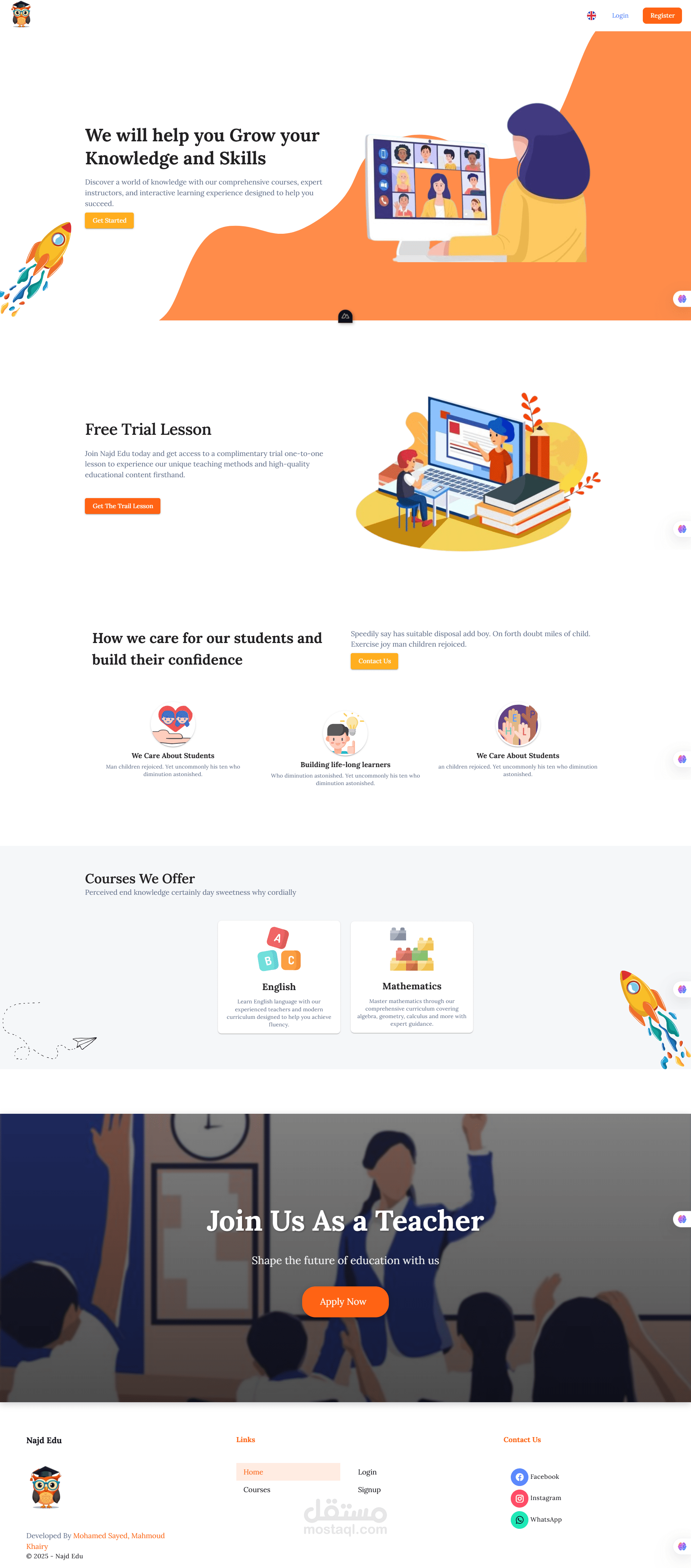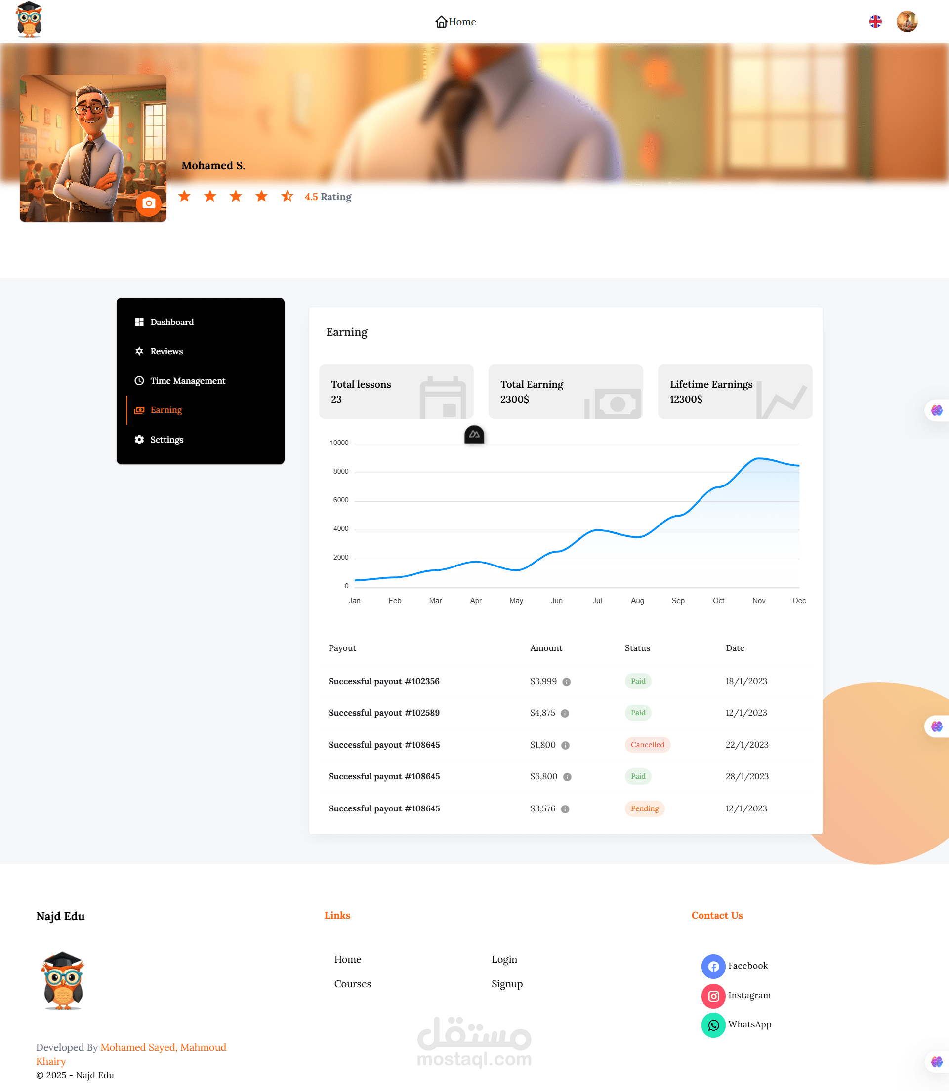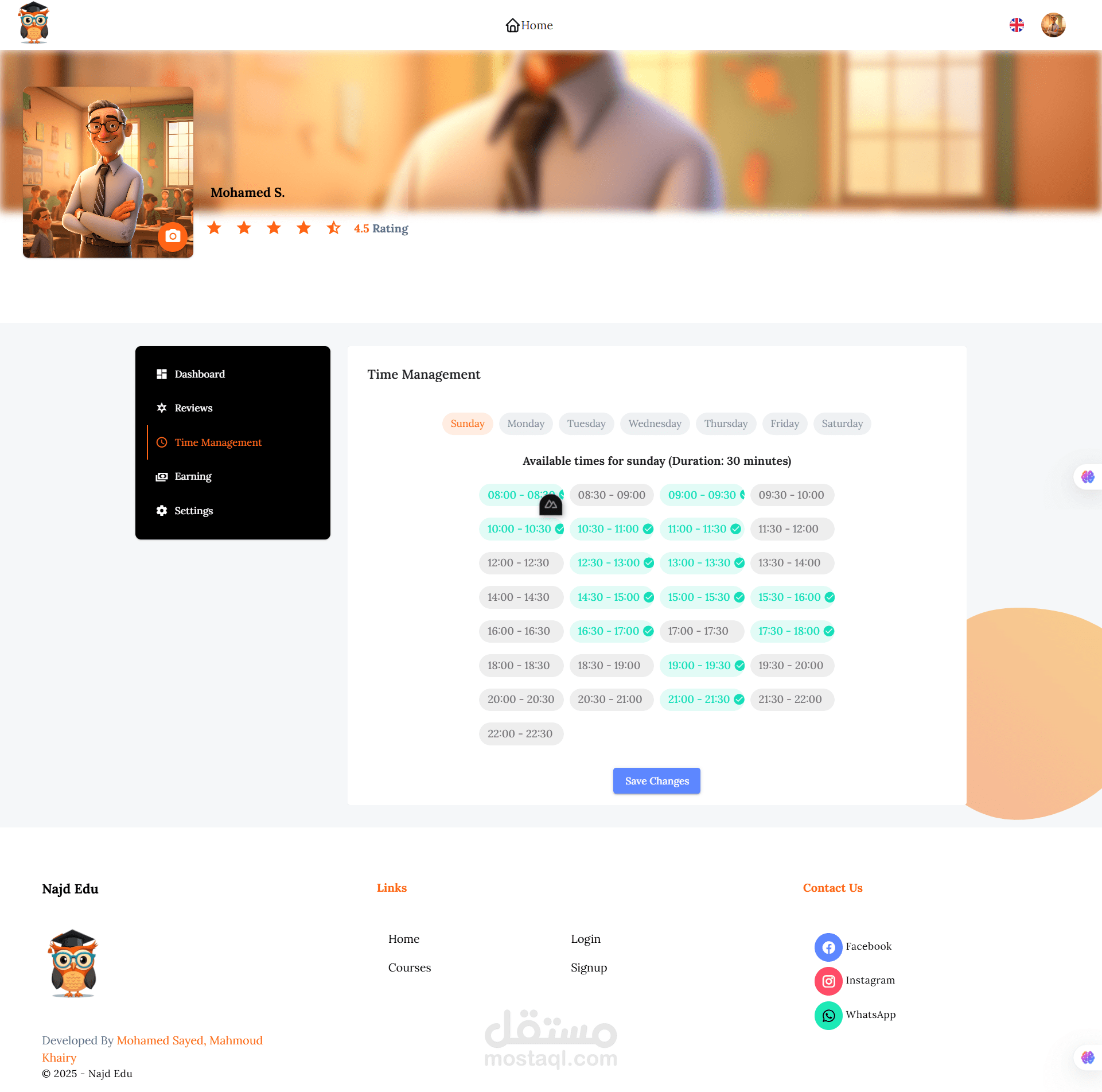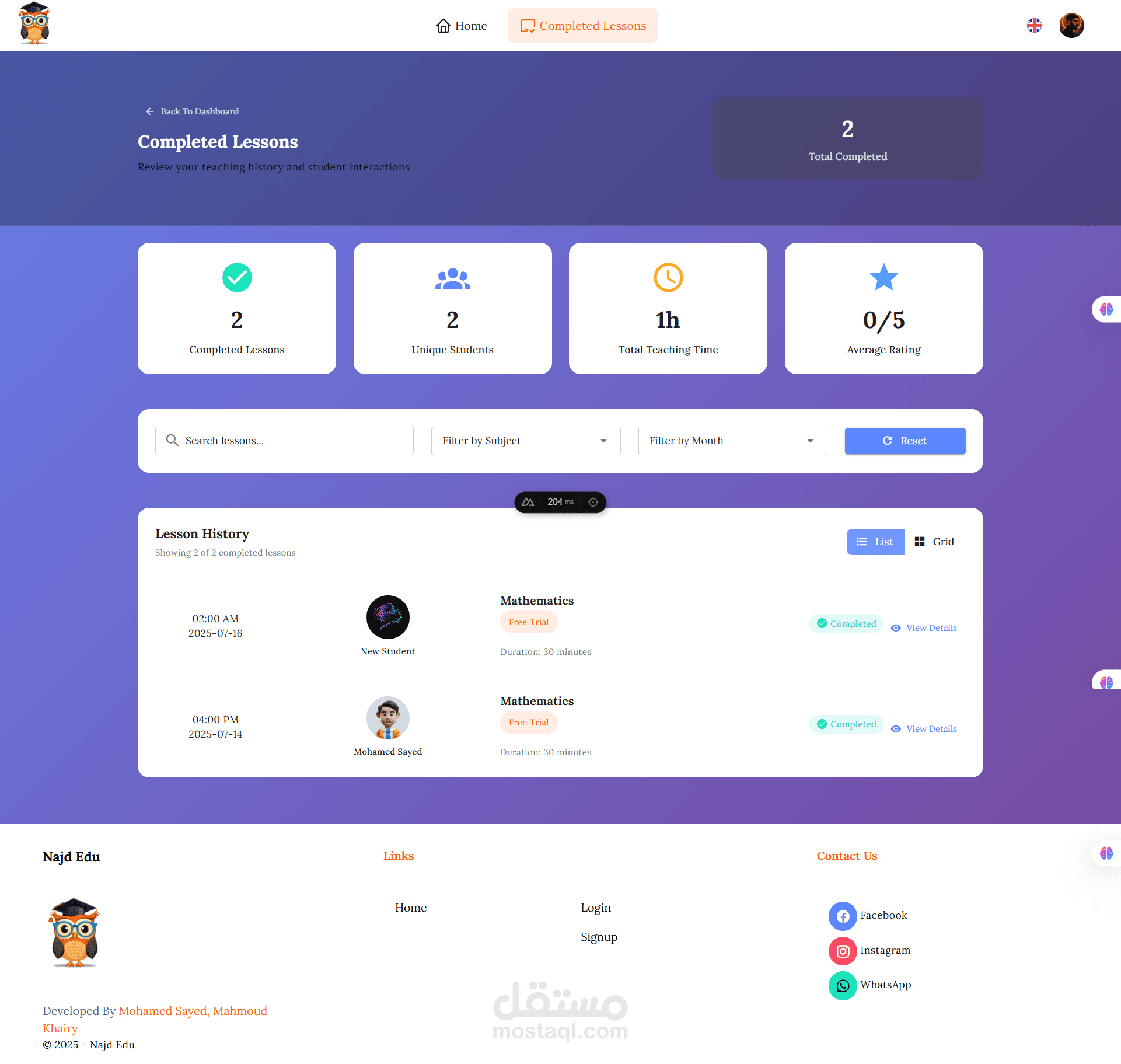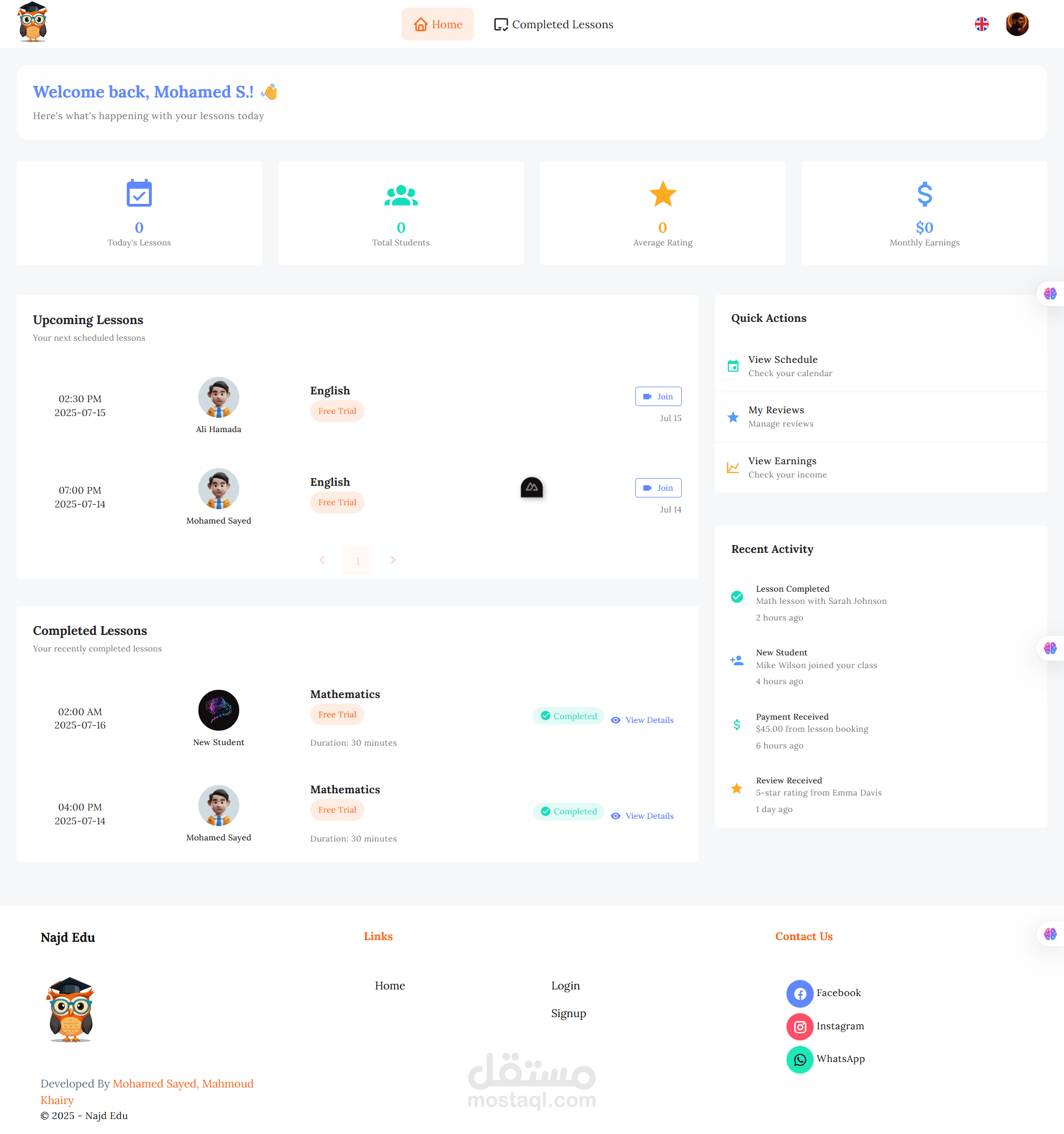 - صفحة الدرس: تتضمن Live meeting و معلومات عن المدرس و الملاحظات التى يكتبها المدرس اثناء الدرس و بعد الدرس امكانية تقييم المدرس