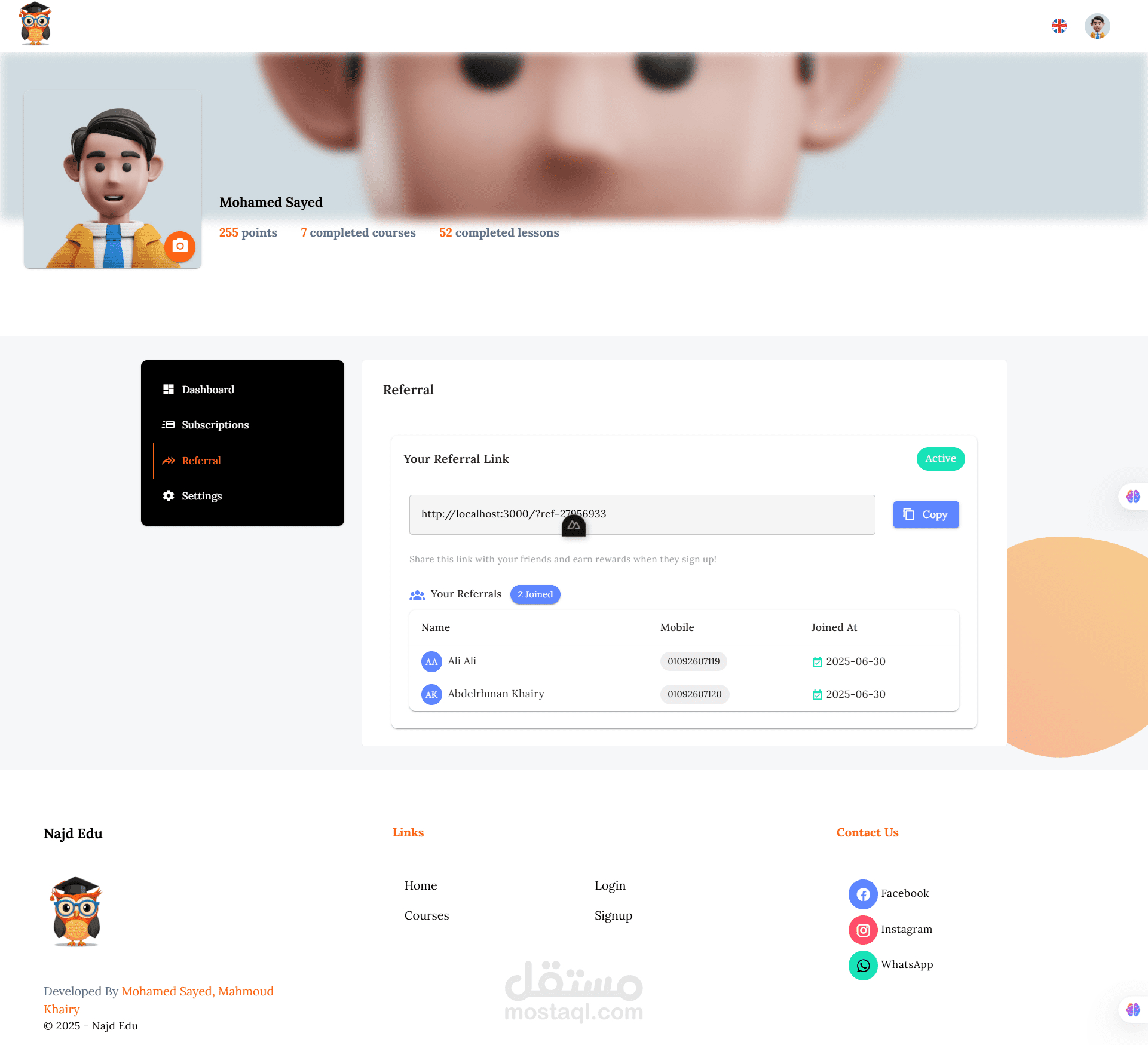 - الاحالة: يمكن للطلاب ان ينشر رابط الاحالة الخاص به ورؤية الطلاب المنضمون للمنصة من خلاله وسحب المكافئات