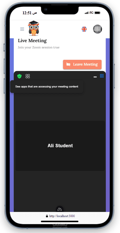 - صفحة الدرس : تتضمن Live meeting وخيارات بدء وانهاء الدرس, كتابة الملاحظات عن الطالب و تغيير مستوى الطالب ( التقدم)