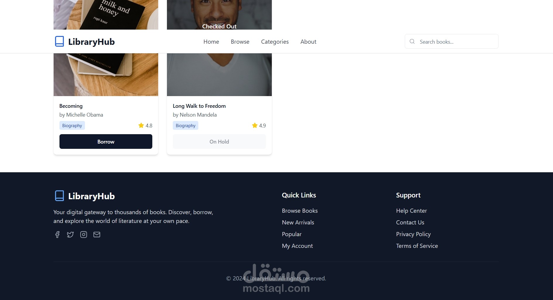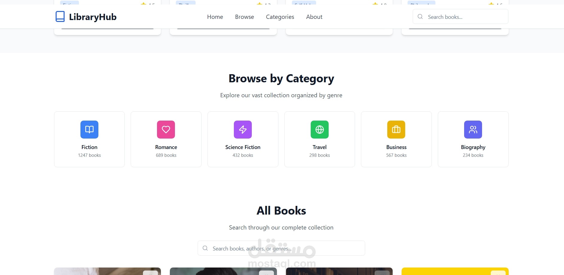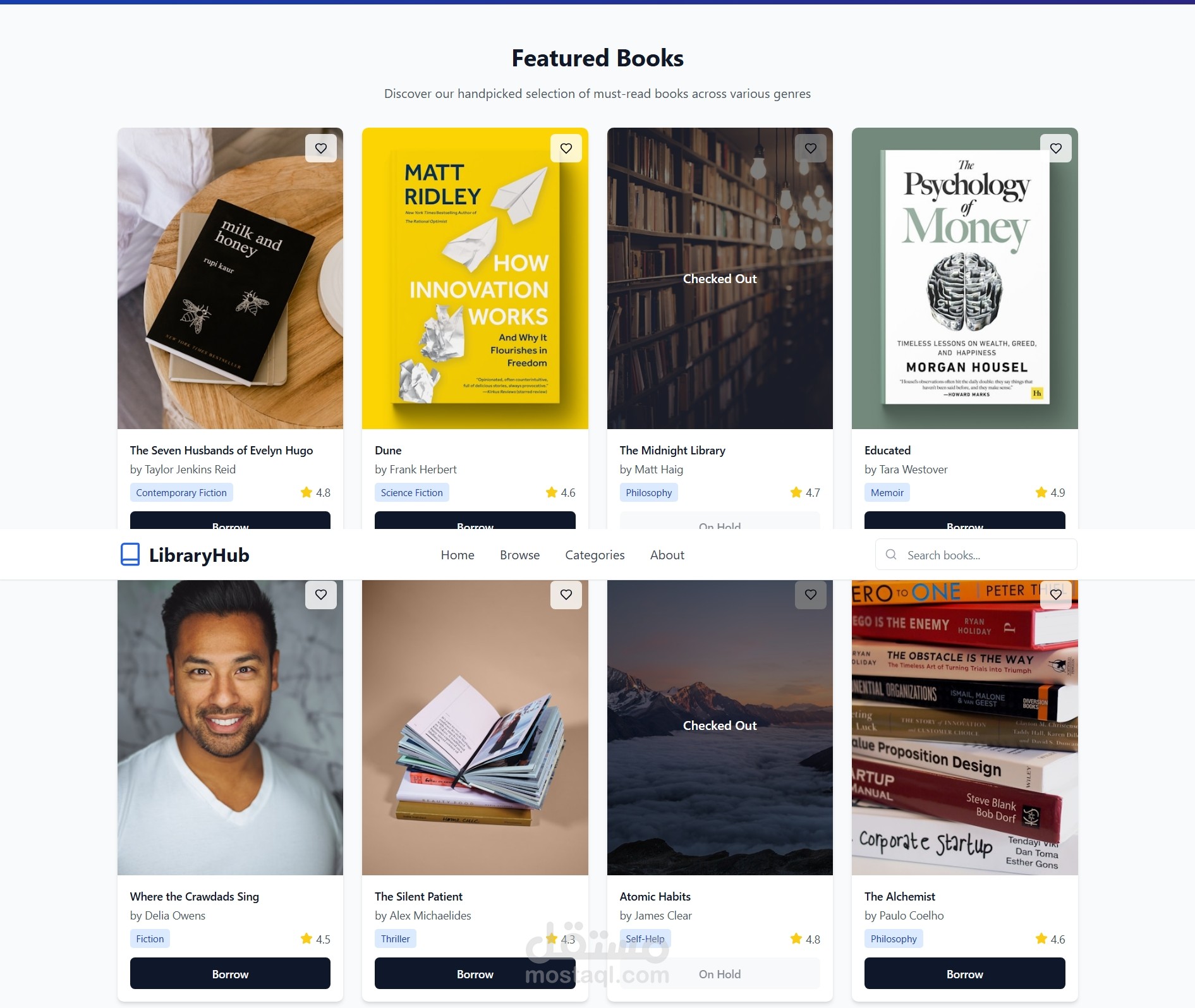 موقع ويب تفاعلي مصمم لعرض مجموعة من الكتب بطريقة أنيقة وسهلة الاستخدام. يتيح للمستخدمين تصفح الكتب ضمن واجهة مريحة وسريعة الاستجابة، مع تصنيف الكتب بطريقة منظمة وجذابة بصريًا. يركز التصميم على تجربة المستخدم البسيطة مع لمسة عصرية.