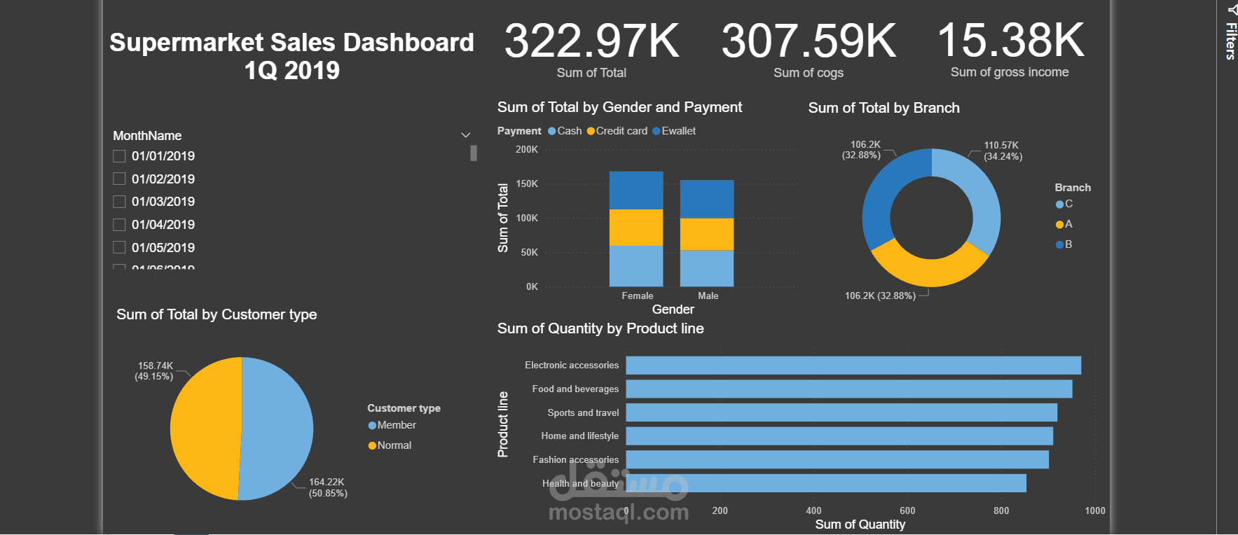 قمت بتصميم لوحة تحكم تفاعلية باستخدام Power BI لتحليل بيانات مبيعات سوبرماركت خلال الربع الأول من عام 2019، بهدف تقديم رؤى تفصيلية حول الأداء العام للمبيعات، وسلوك العملاء، وأنماط الشراء المختلفة.