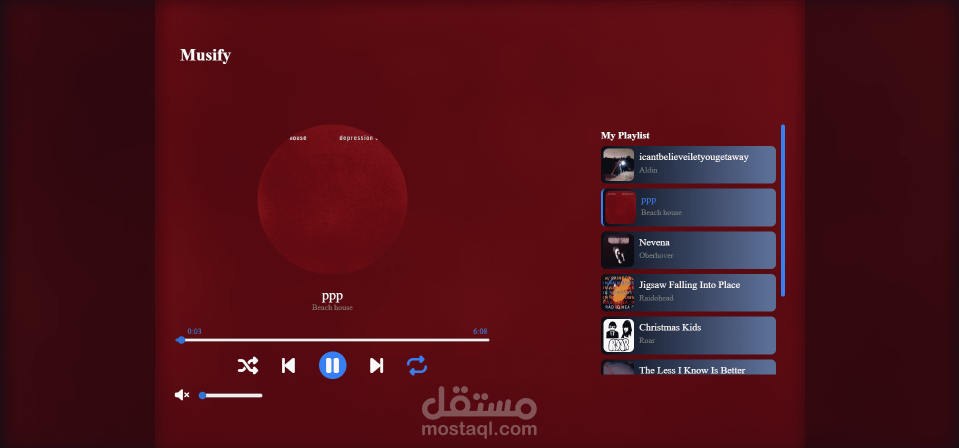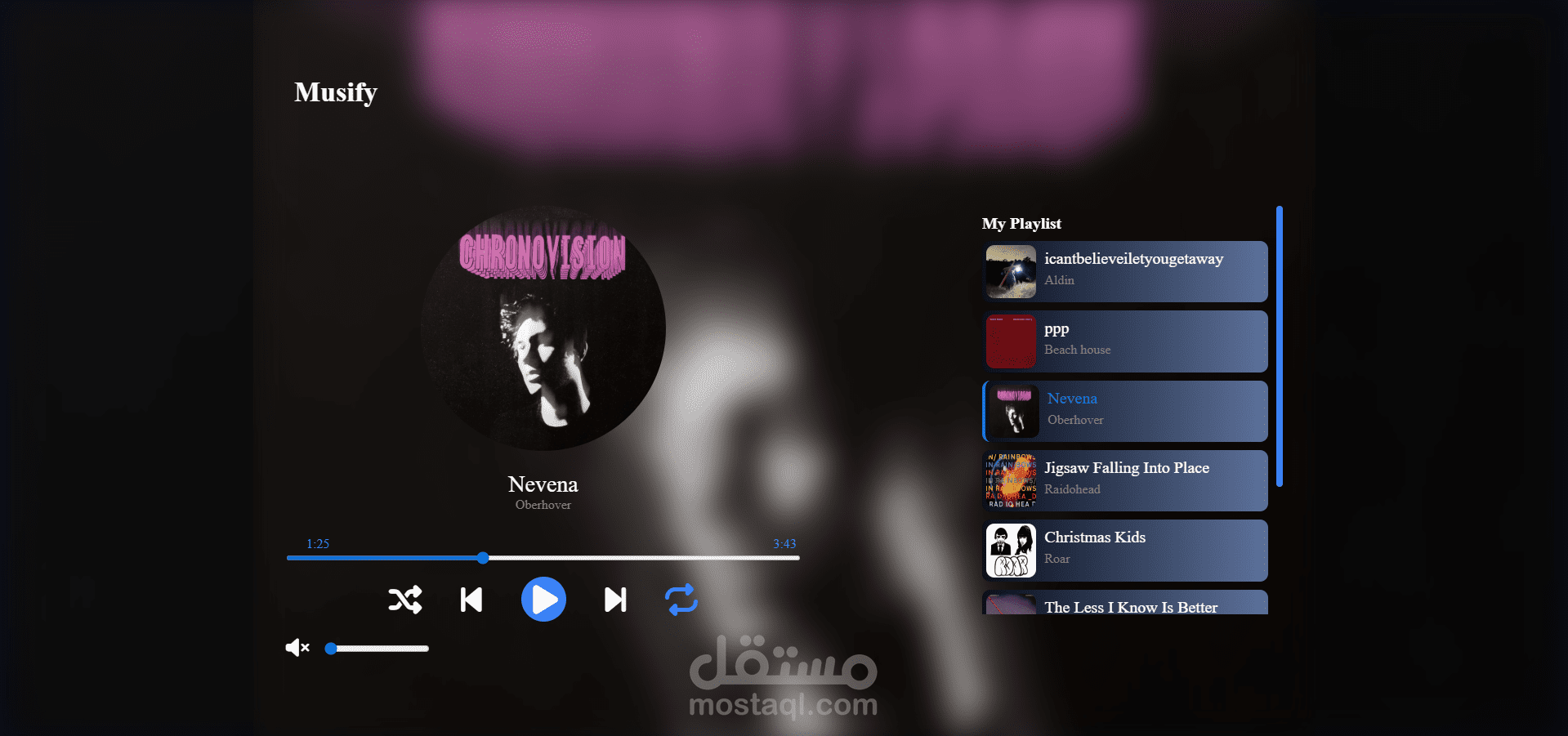 منصة موسيقية ويب تفاعلية تتيح للمستخدمين تشغيل الأغاني، تصفح قائمة التشغيل، التحكم بالصوت، والتنقل بين المسارات بسهولة. تم تطويرها باستخدام HTML وCSS وJavaScript مع واجهة أنيقة وتجربة مستخدم سلسة.