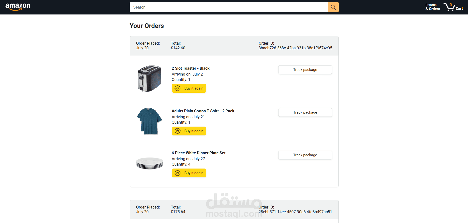 تجربة أولية لإنشاء نسخة من واجهة متجر أمازون باستخدام JavaScript مع تطبيق نمط التصميم MVC. يتضمن المشروع صفحات متعددة مثل الصفحة الرئيسية، عربة التسوق، الطلبات المرتجعة، مع توليد ديناميكي للعناصر باستخدام الجافاسكريبت وجلب البيانات.