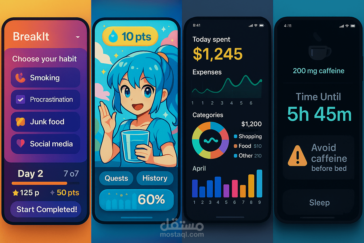 From gamified water trackers and mental health companions to financial habit dashboards and kids’ learning tools, each screen is 100% original, crafted with precision, color strategy, and user psychology in mind.