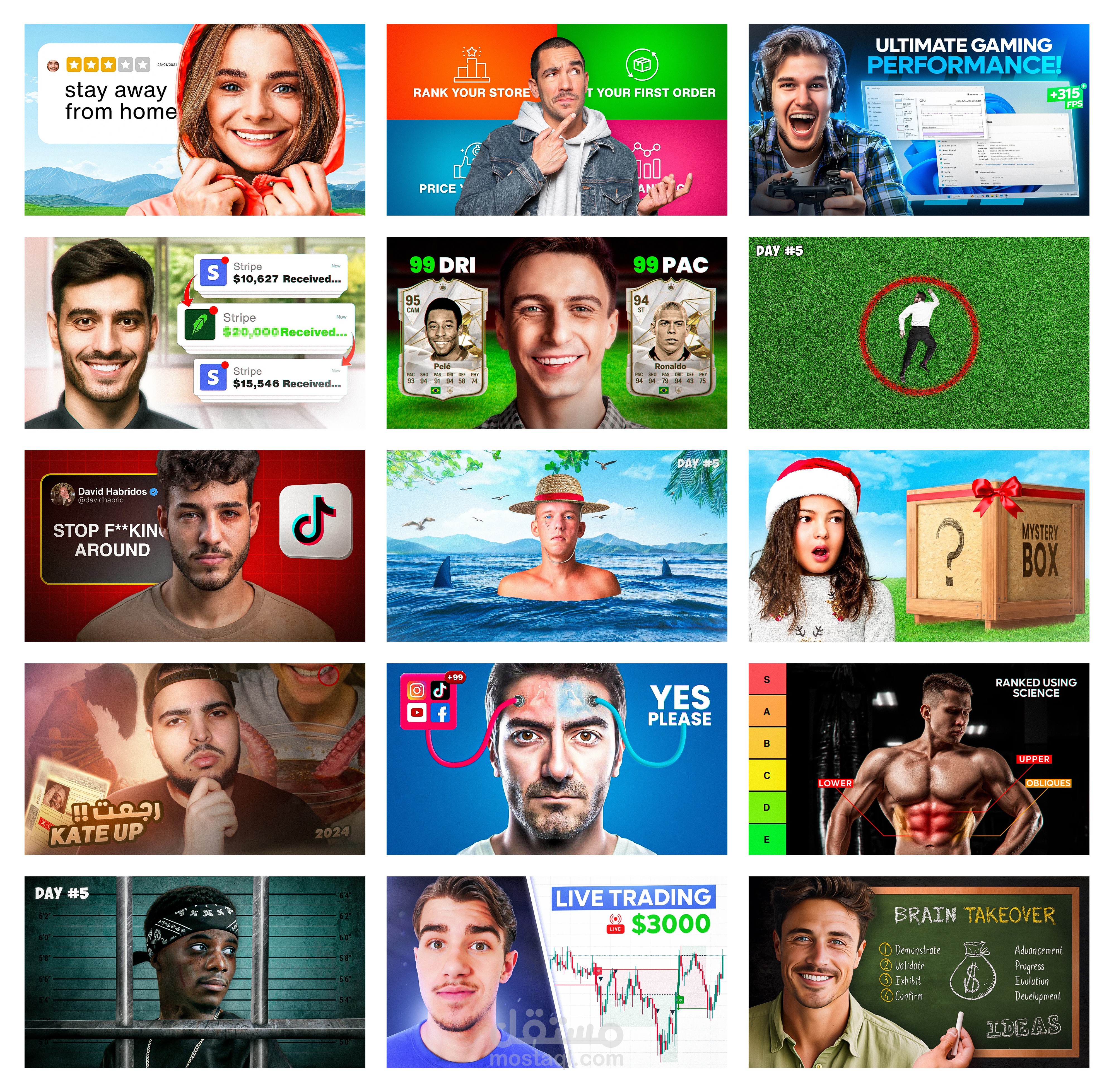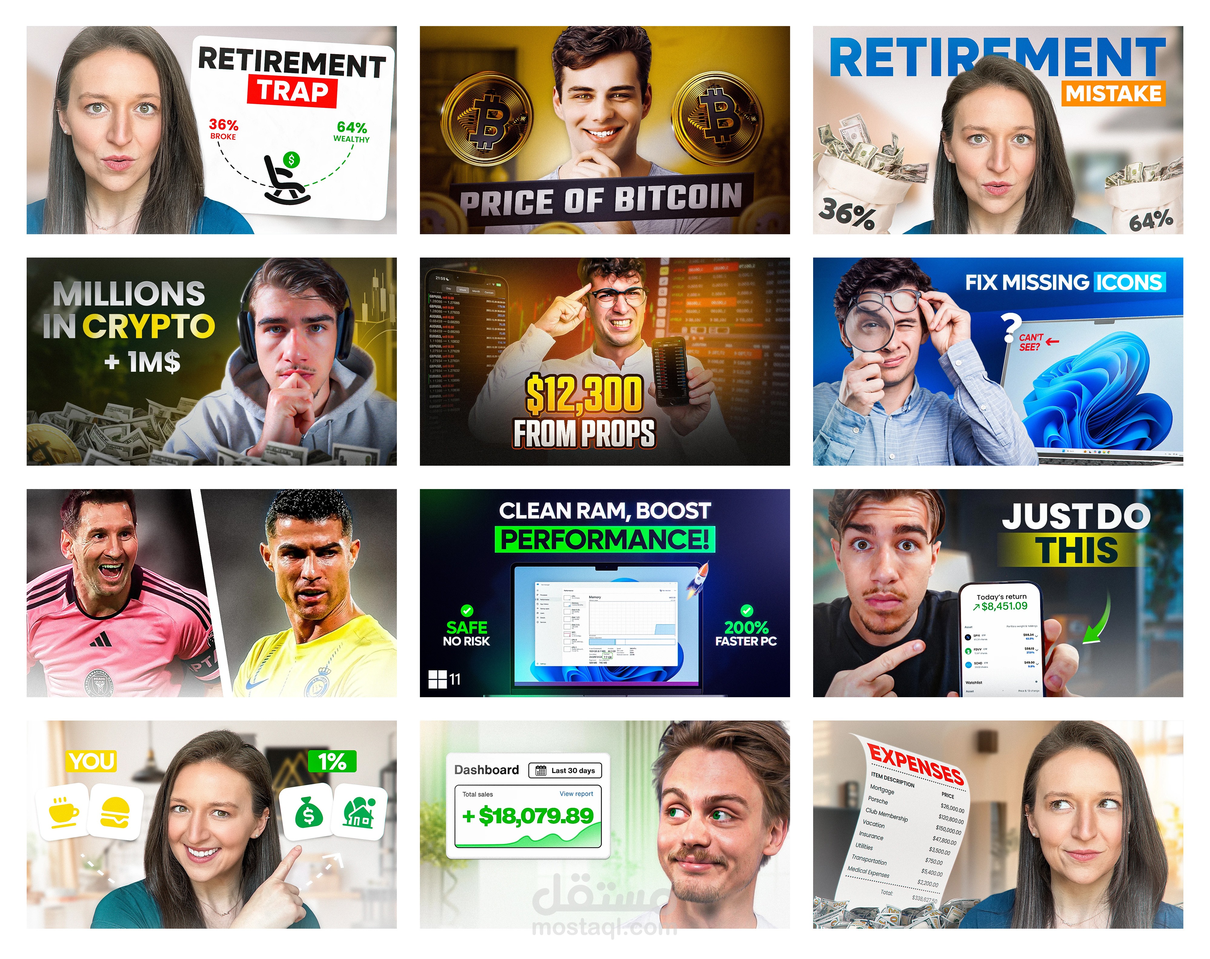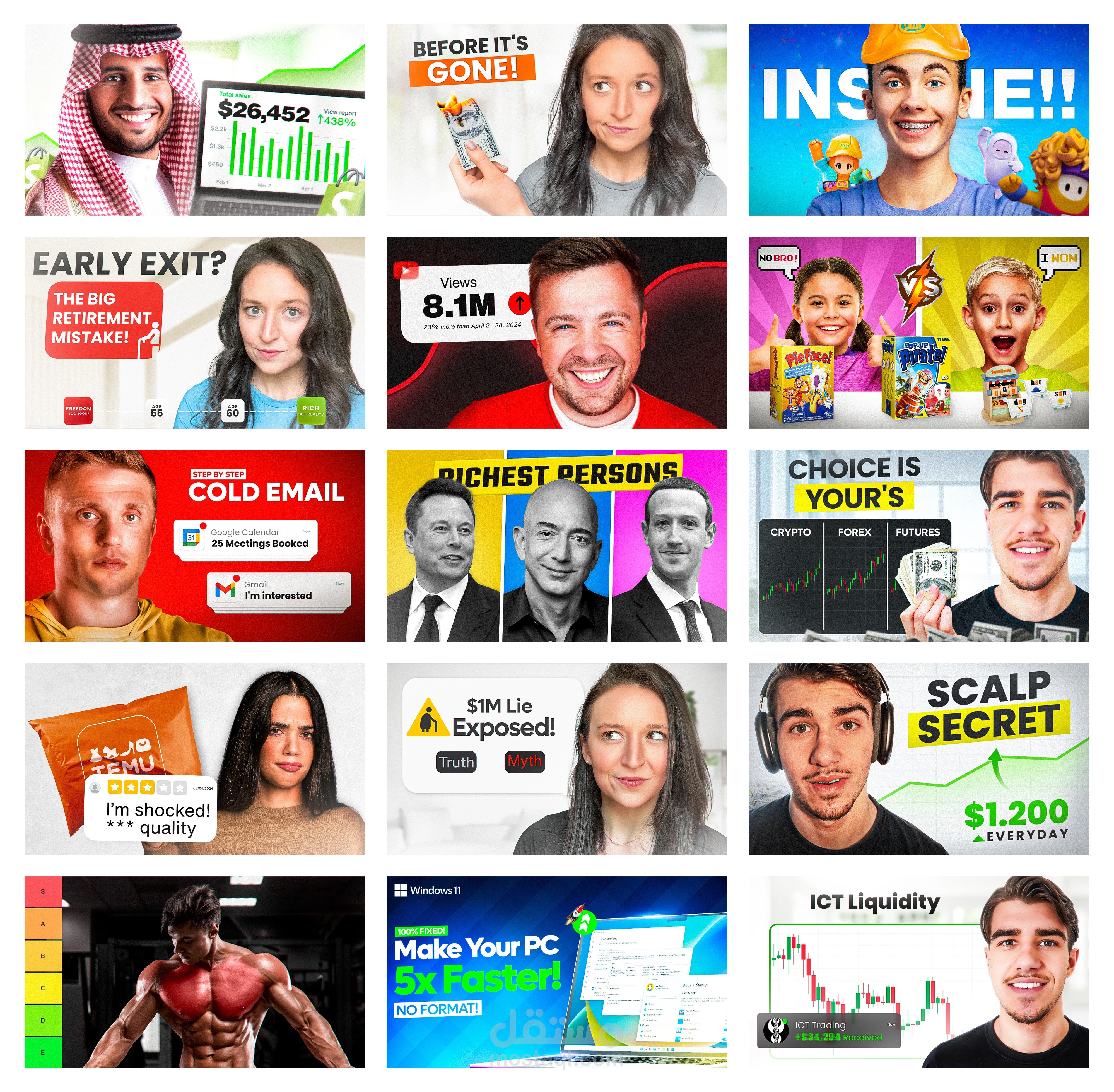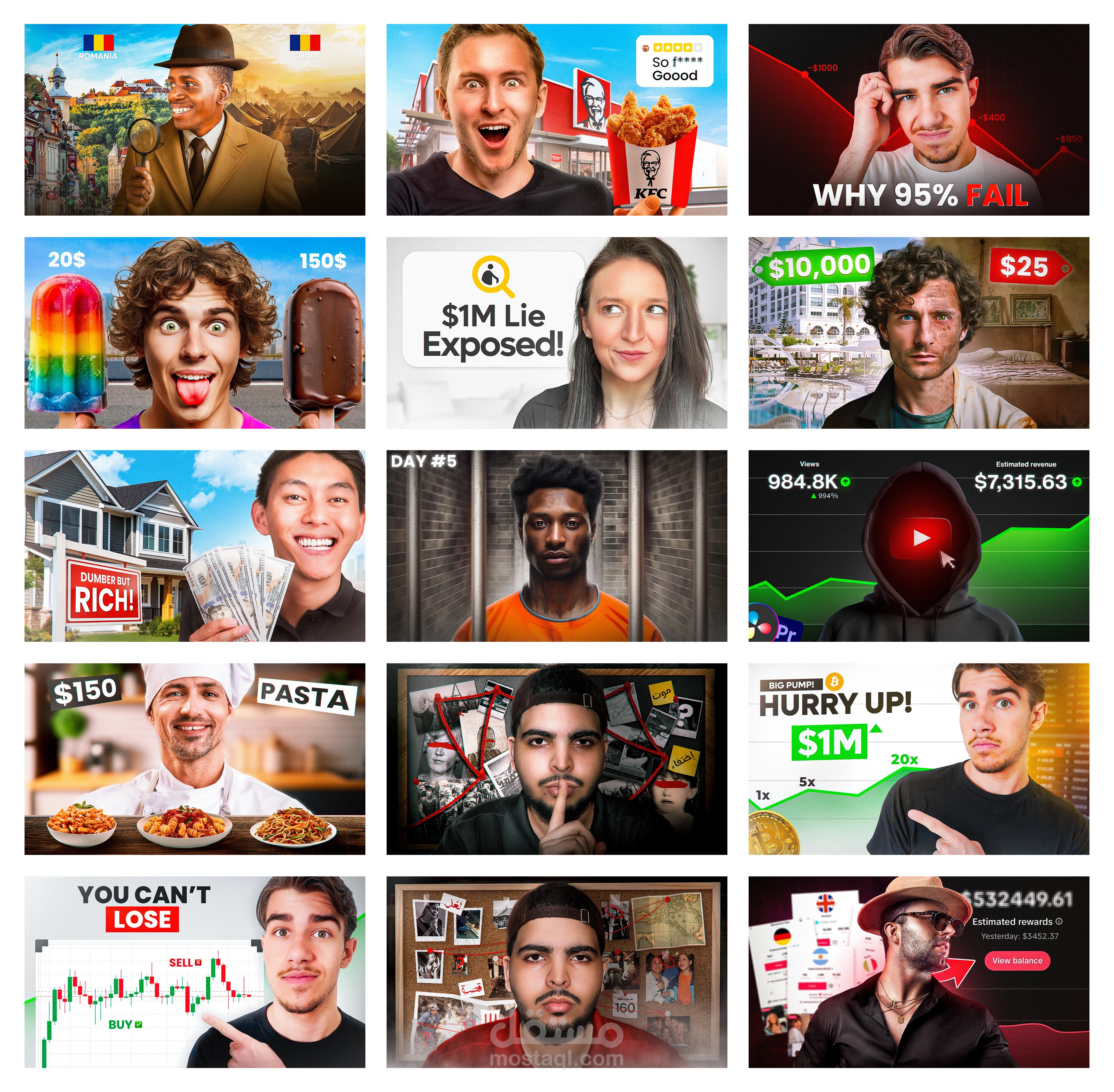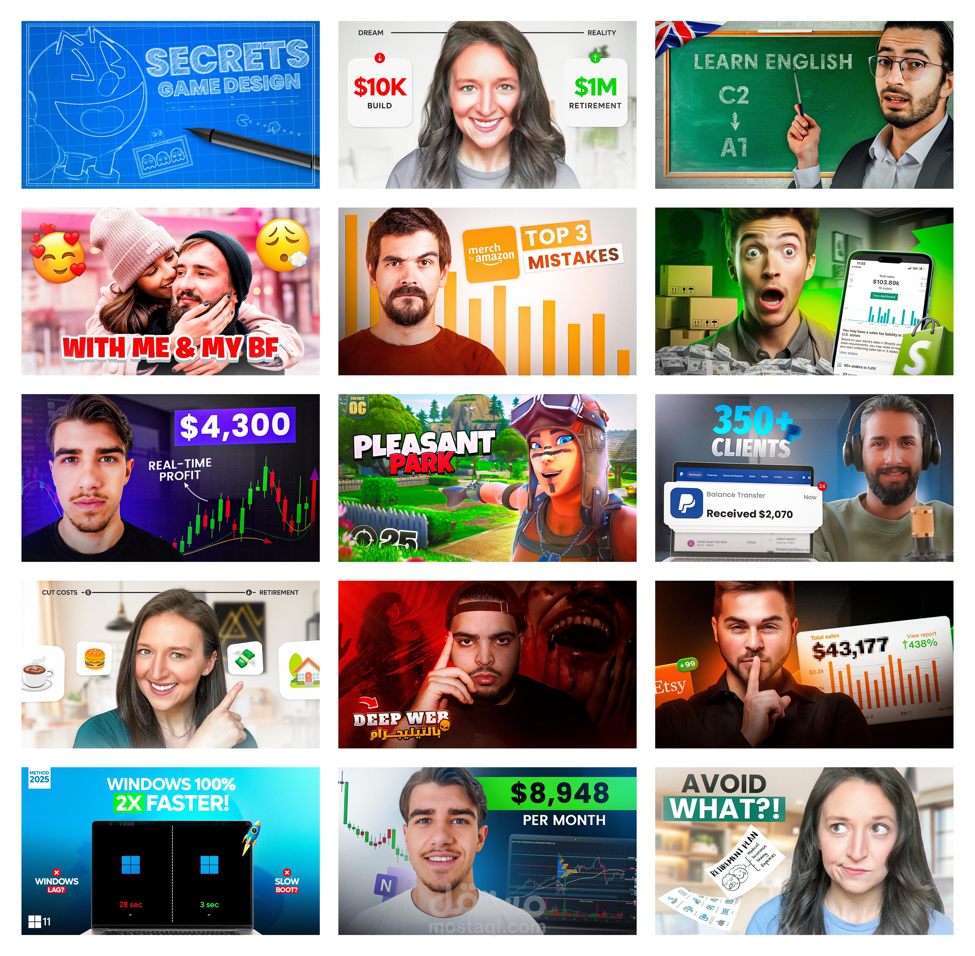 أقدّم هنا نماذج من أعمالي مع منشئين في مجالات متنوّعة مثل الحياة الواقعية، التقنية، التداول، أسلوب الحياة وغيرها… ينصبّ تركيزي على ابتكار صور مصغّرة استراتيجية عالية التأثير تلفت الانتباه وتعزّز معدل النقر إلى الظهور CTR بشكل ملحوظ. أُكيّف منهجيتي مع هوية كل منشئ لضمان تميّز محتواهم ونمو قنواتهم. تصاميمي تُعدّ محرّكًا أساسيًا للتفاعل مع المشاهدين وتوسيع قاعدة الجمهور.