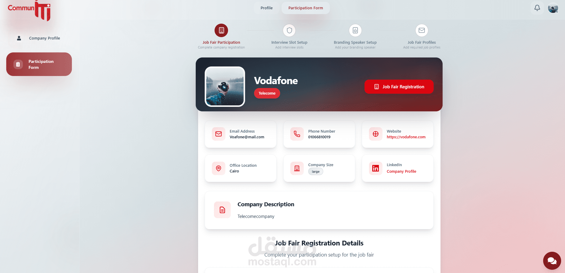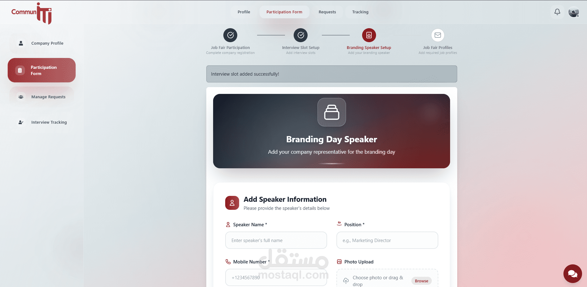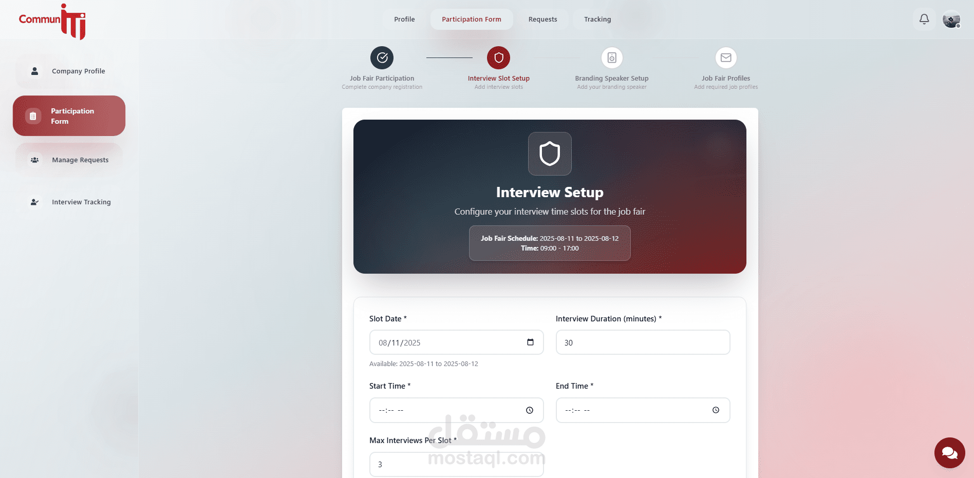 يُمكن للشركة من خلال حسابها المشاركة في الفعالية، تعبئة بياناتها، إدارة طلبات المقابلات من الطلاب، وتتبع جدول المقابلات الخاص بها.