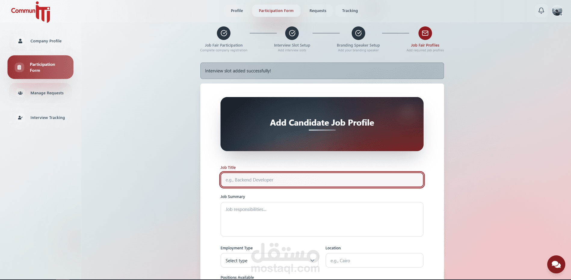 يهدف المشروع إلى تسهيل تنظيم الفعاليات، وتمكين الشركات من عرض فرصها، والسماح للطلاب بحجز مقابلات مباشرة مع ممثلي الشركات، وكل ذلك من خلال واجهات احترافية مبنية باستخدام React وTailwind CSS، مع Laravel في الخلفية (Back-End).