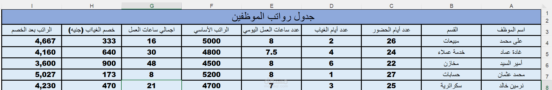 الملف منسق بالكامل ليسهل تتبع بيانات الموظفين, ويعتمد علي دوال مثل If و Sum لحساب الخصومات والصافي تلقائيآ بدون تدخل يدوي .