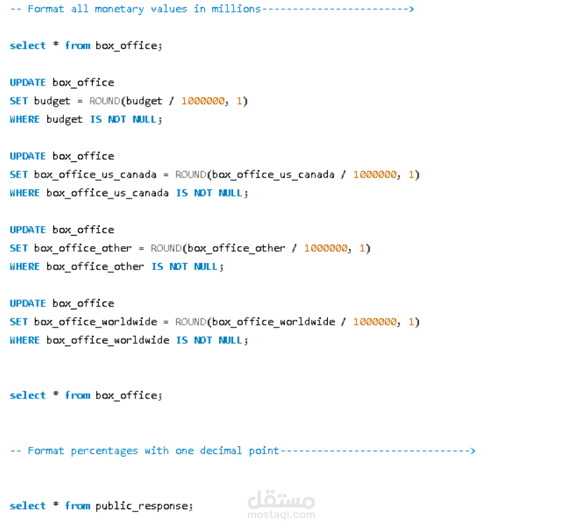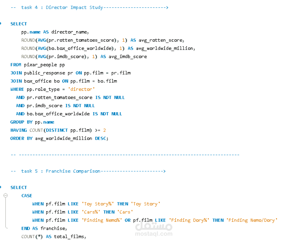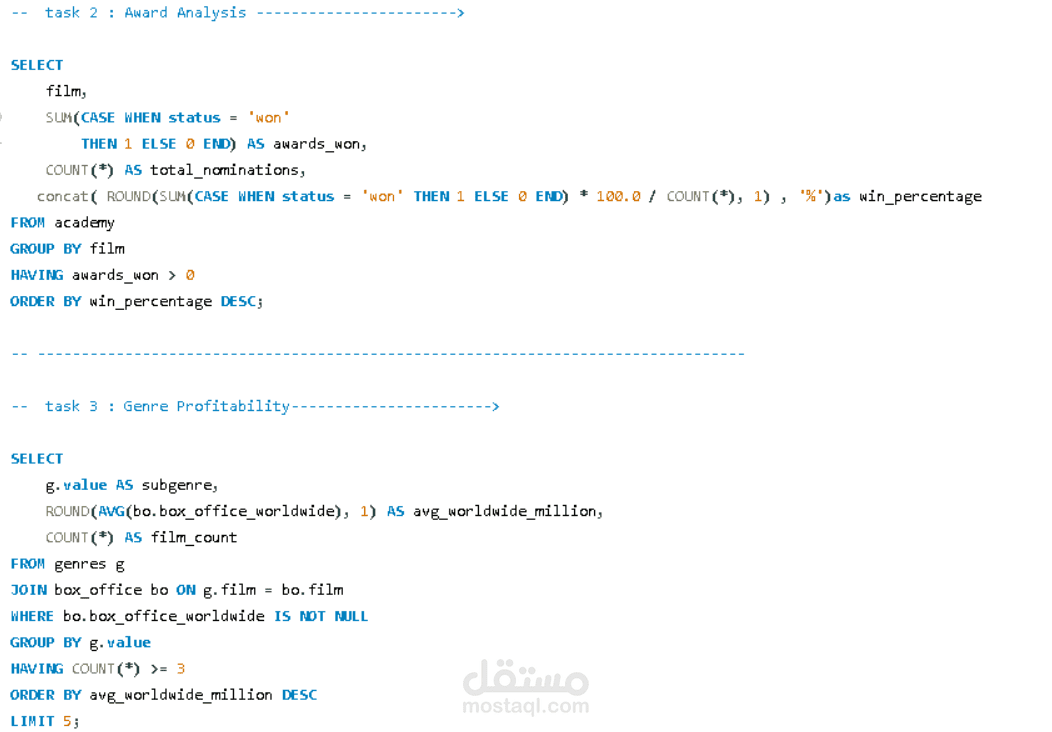 تم تنفيذ الاستعلامات باستخدام ORDER BY, GROUP BY, CASE, ودوال رياضية لتحديد العلاقة بين الميزانية والعائد وربطها بفترة الإصدار.