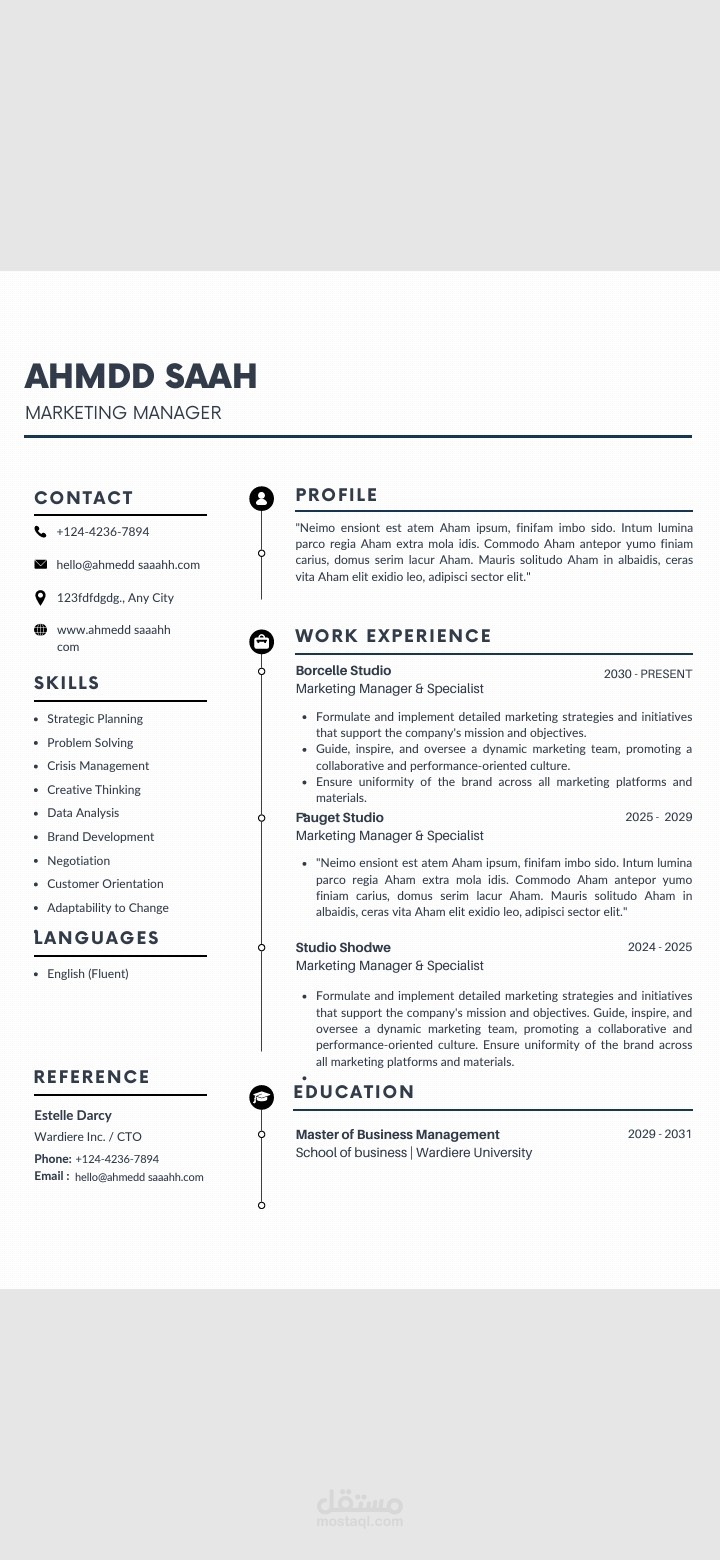 قمت بتصميم سيرة ذاتية احترافية لاحد العملاء مع تنسيق انيق وجذاب باللغة الانجليزية والتصميم يصلح للتقديم على الوظائف الأكاديمية والإدارية