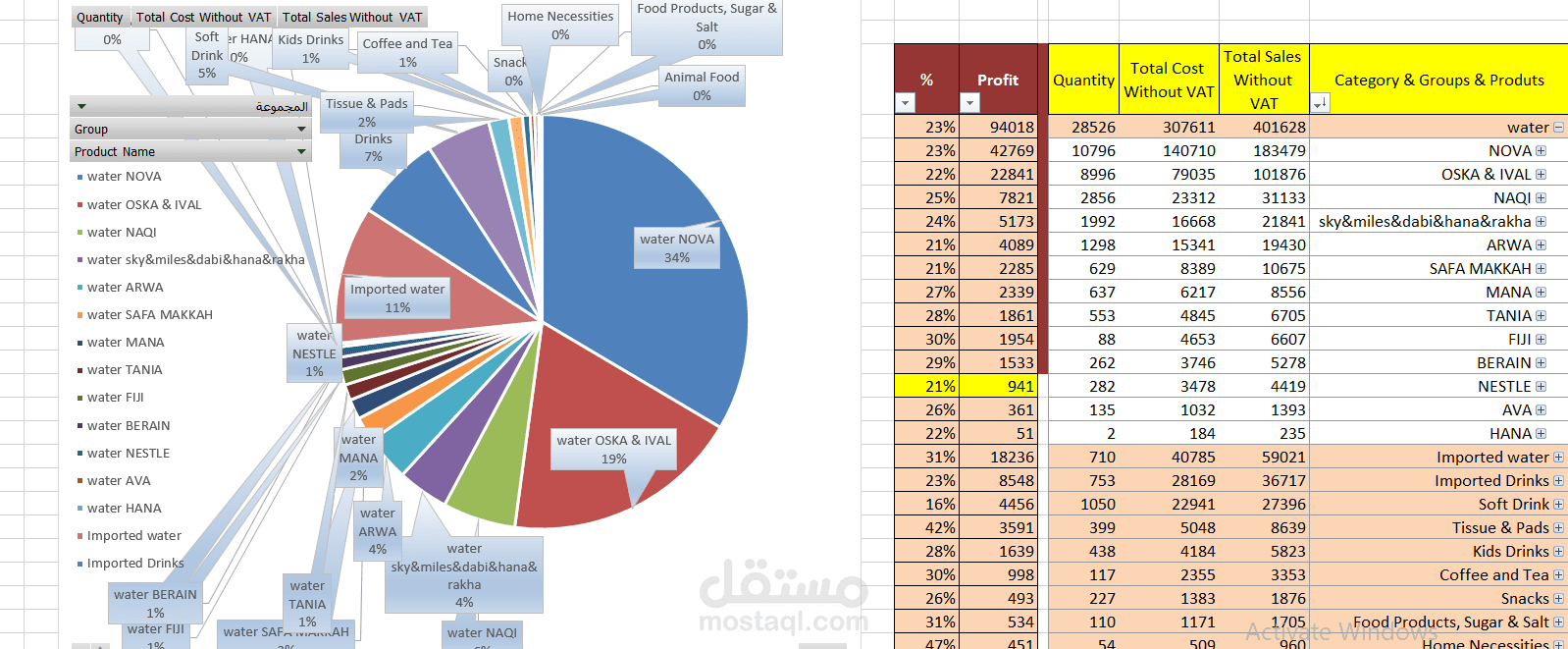 تحليل بيانات المبيعات لمجموعة من المنتجات وتوضيح تكلفة كل منتج ونسبة الارباح