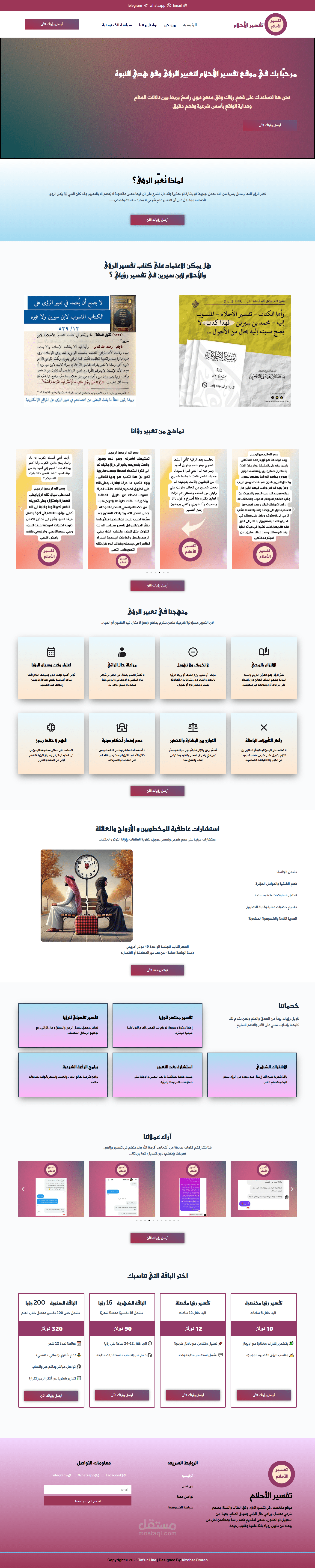 TafsirLine.com هو موقع رقمي متخصص في تفسير الأحلام وربط دلالات الرؤى بالواقع وفق منهج شرعي. تم تصميم الموقع باستخدام ووردبريس، مع واجهة تفاعلية تتيح للزائر إرسال حلمه مباشرة عبر نموذج رقمي، ليقوم الفريق بتفسيره بأسلوب مبسّط مستند إلى النصوص الإسلامية الثابتة. يتميز الموقع بتصميم مرن وسلس، متجاوب مع مختلف الأجهزة، مع تنظيم واضح لأقسام مثل طلب تفسير، مقالات تفسيرية، وتدوينات عن رموز الأحلام. تم الاهتمام سريع الأداء، تحسين محركات البحث، وتجربة استخدام مريحة تتيح للزوار فهم رؤاهم وتطبيقها روحياً ونفسياً.