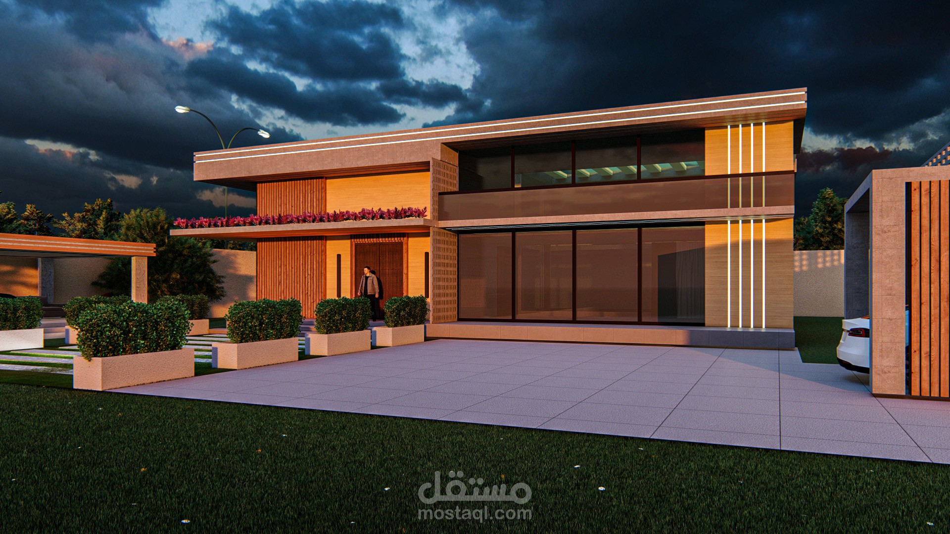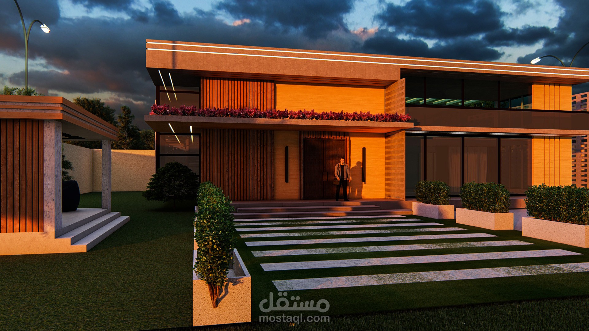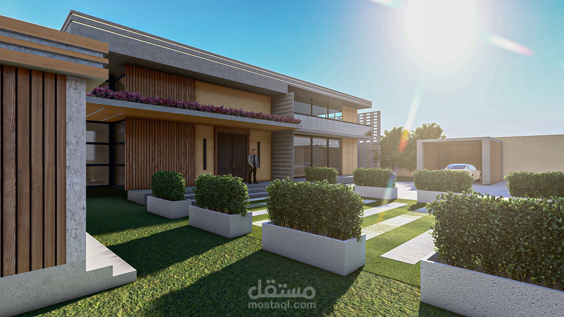 تم تصميم فيلا سكنية بطابع معماري عصري، يراعي التوازن بين الجمالية والوظيفية، مع استخدام مواد طبيعية مثل الخشب والزجاج والخرسانة، لإضفاء طابع حديث وراقي على المبنى. يهدف التصميم إلى إبراز التفاصيل المعمارية في مختلف أوقات اليوم، من خلال معالجة الإضاءة والظلال بأسلوب واقعي.