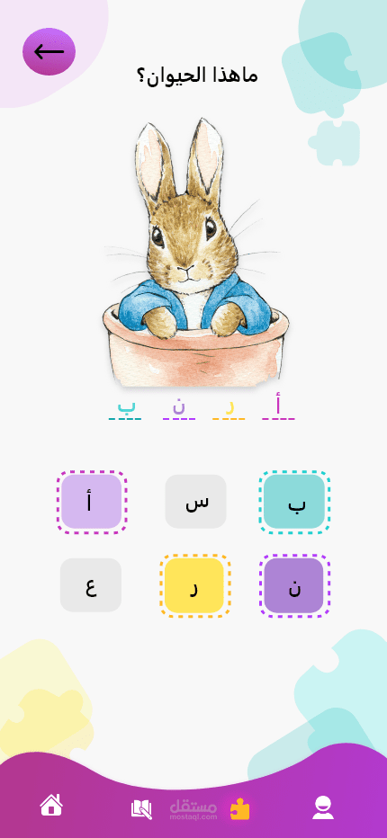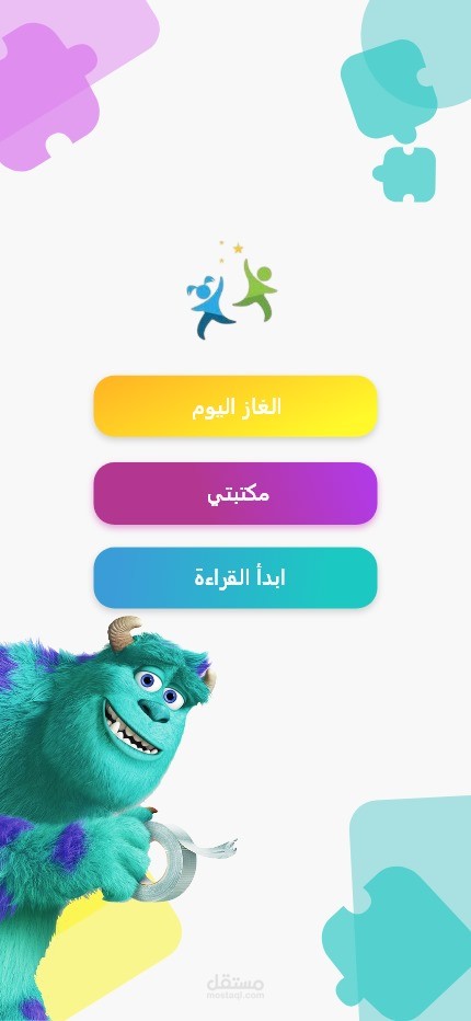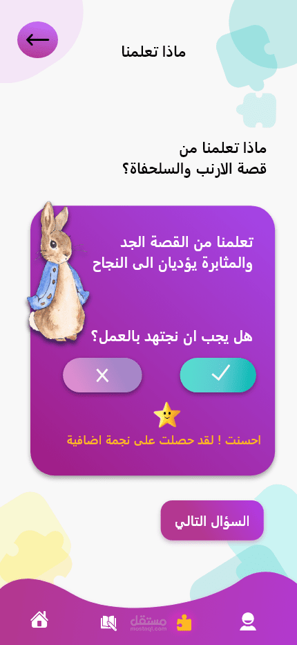 صممت الواجهات بأسلوب بصري جذاب يناسب الفئة العمرية المستهدفة، مع استخدام ألوان مبهجة، شخصيات محببة، وأسئلة تفاعلية بعد كل قصة لتعزيز الفهم وقسم الالغاز