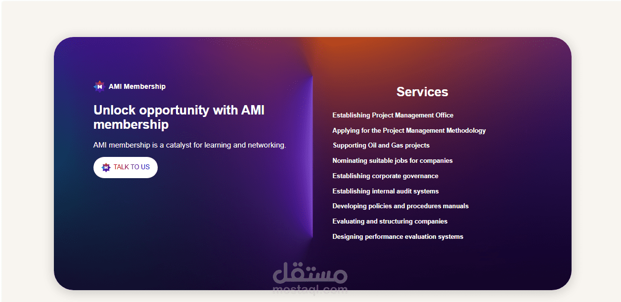 موقع "AMI" يتميز بتصميم عصري وألوان جذابة مستوحاة من التكنولوجيا الحديثة. يقدّم رسالة تحفيزية تتعلق بتطوير المسار المهني مع بداية عام جديد، ويشجع الزوار على الاستكشاف من خلال زر دعوة واضح. التصميم متوازن بين الجرافيك الجذاب والنص الموجّه للمستخدم.