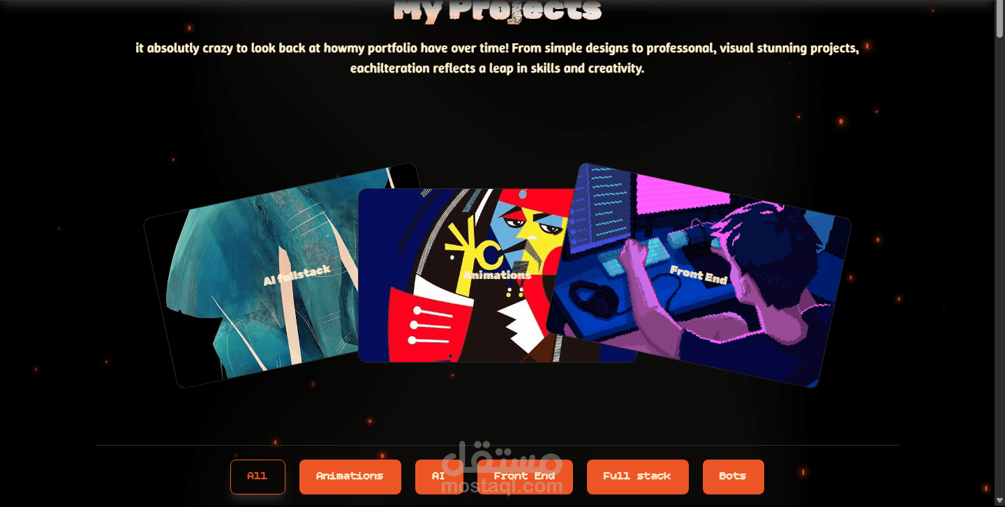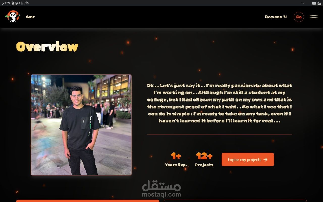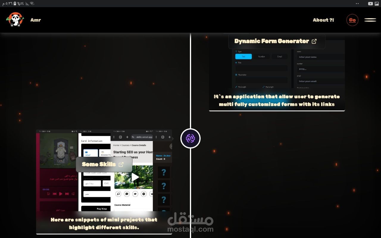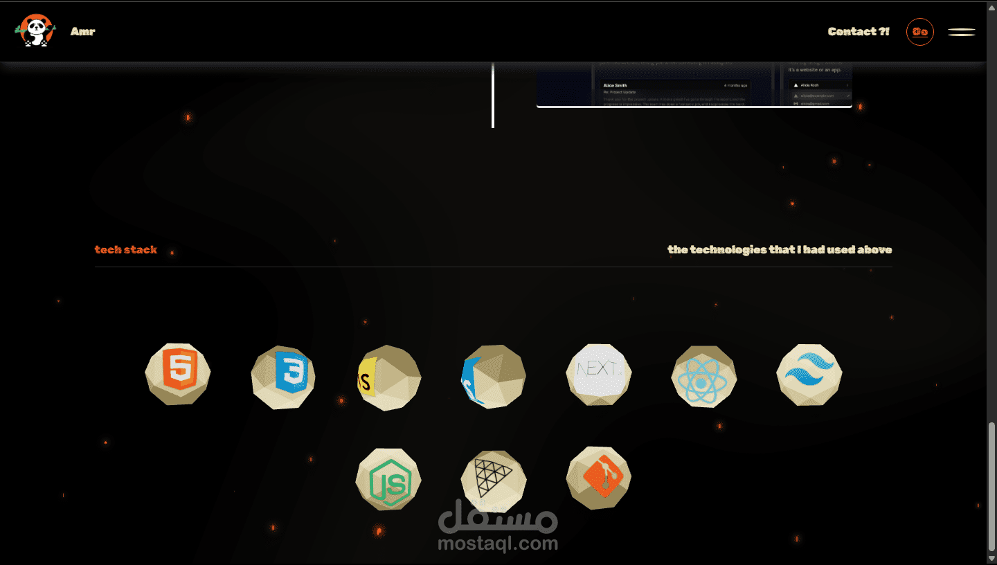 يبرز هذا العمل القدرة على تنفيذ اى اشكال جمالية واضافتها لواجة الموقع وتطبيق الانيميشن داخل Canvas element , كما يهتم ايضا المشروع بامكانية عرض الخبرات والاعمال السابقة وكل المعلومات عن العميل بصورة جميلة وببعض ال animation effects