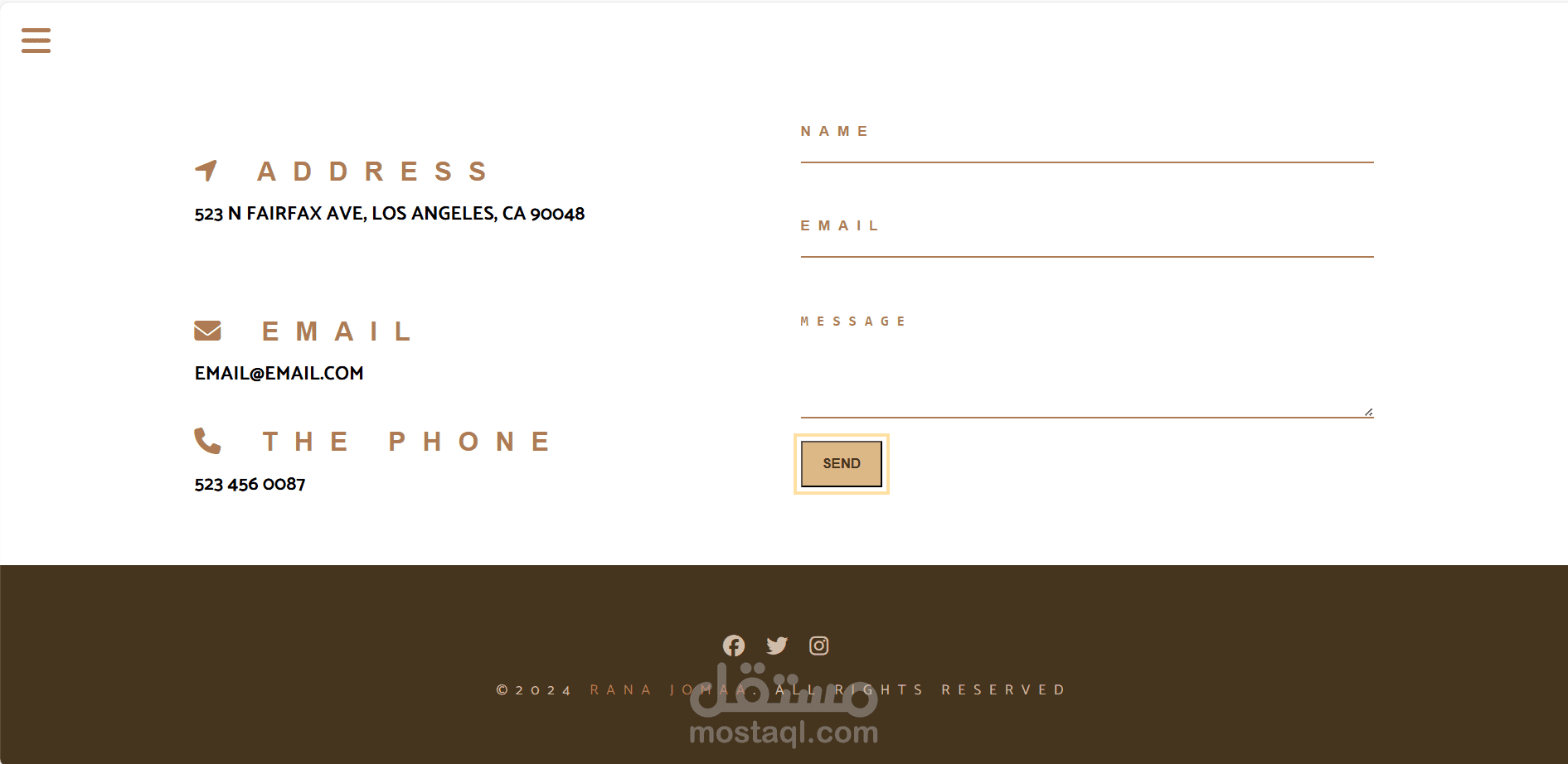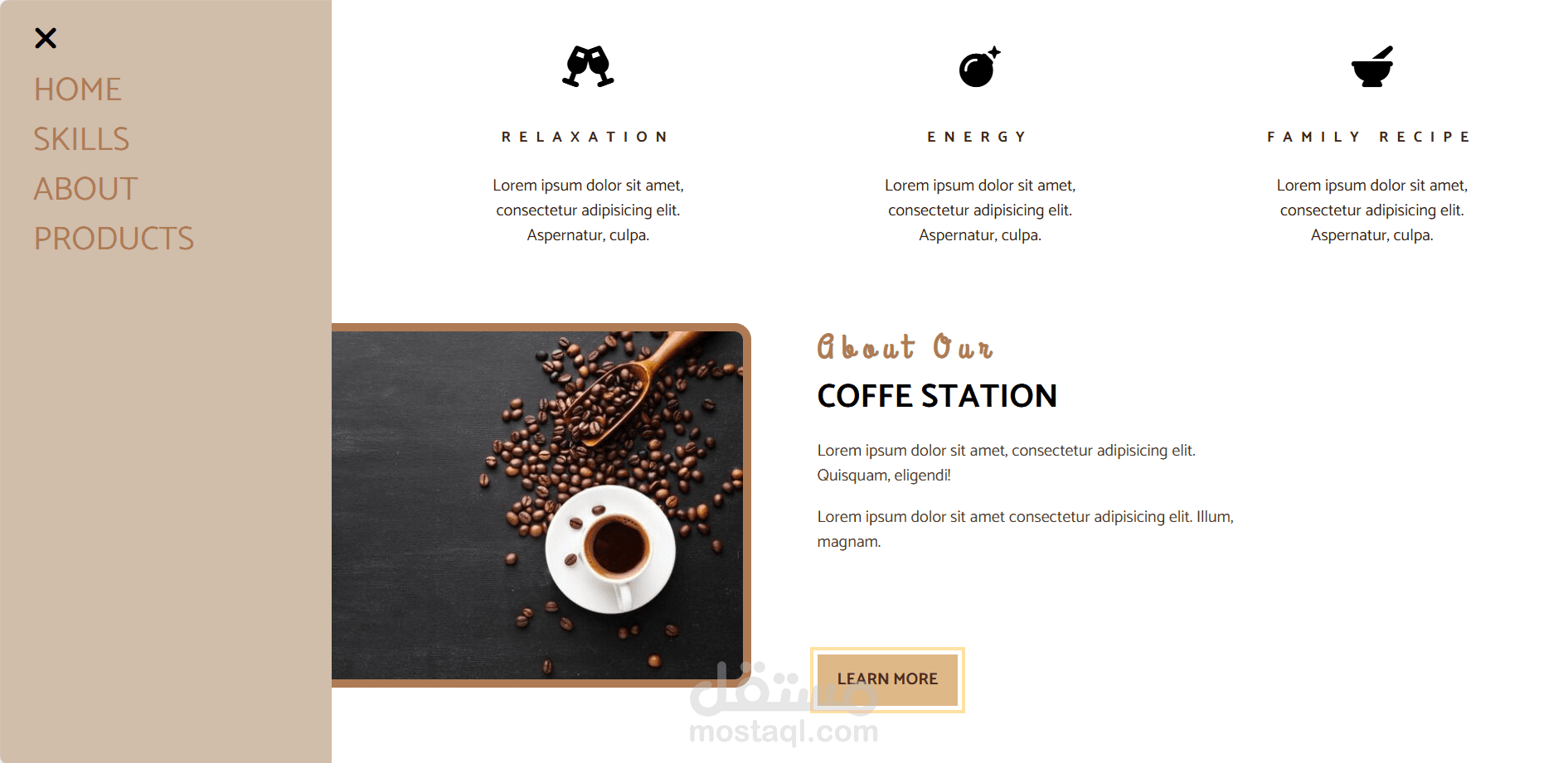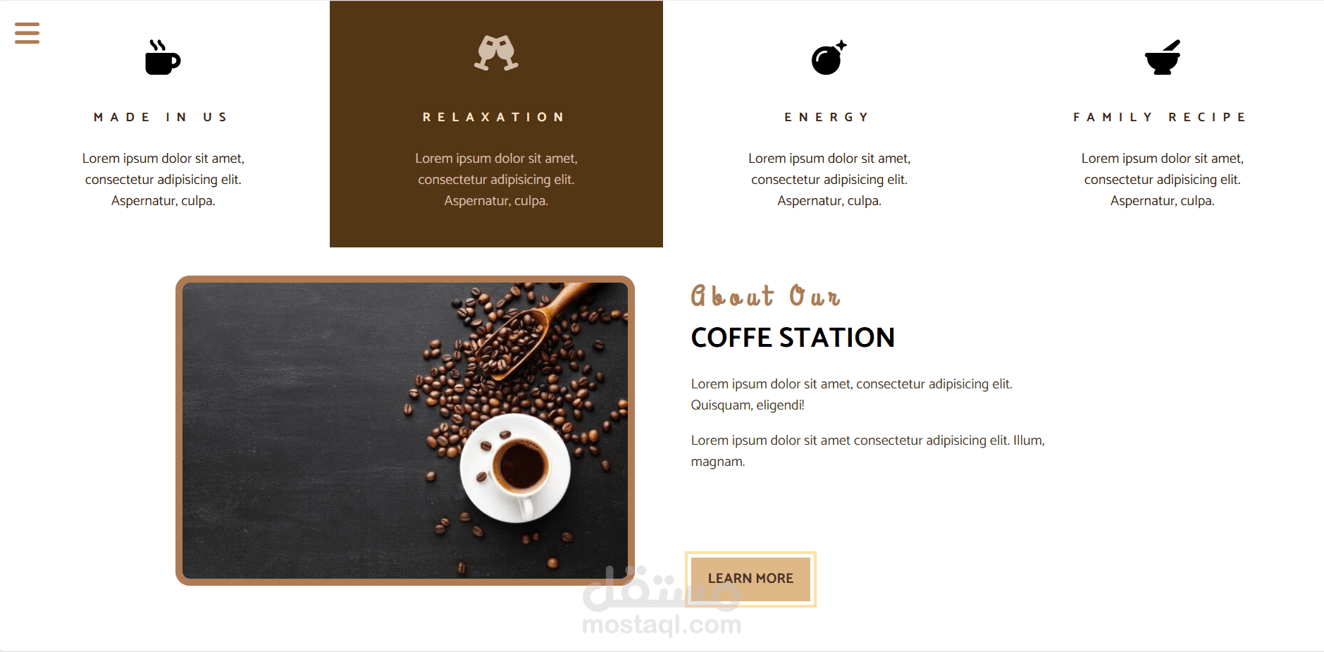 موقع تعريفي أنيق لمقهى مستقل تم تطويره باستخدام HTML, CSS, JavaScript.