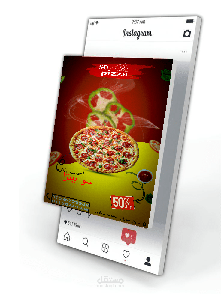 الصورة عبارة عن بوستر إعلاني لمطعم بيتزا باسم "So Pizza"، وهو مصمم بأسلوب جذاب وملون لجذب الانتباه، ويحتوي على العناصر التالية:
