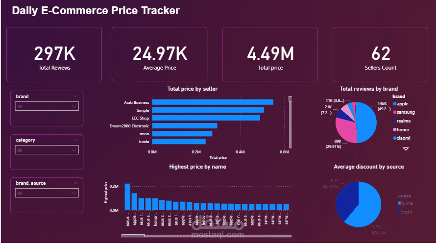 قمت ببناء لوحة تحكم تفاعلية باستخدام Power BI لجمع وتحليل بيانات الأسعار والخصومات من مواقع مثل جوميا، نون، وأمازون.