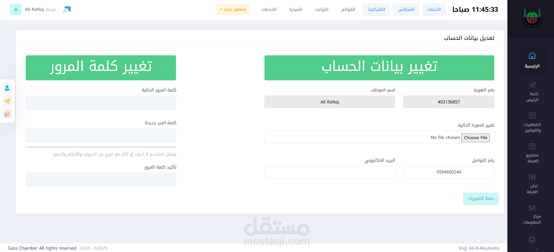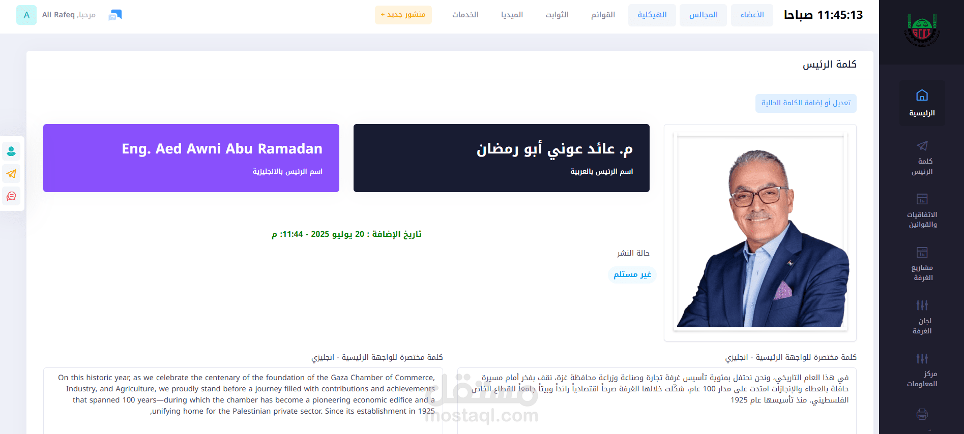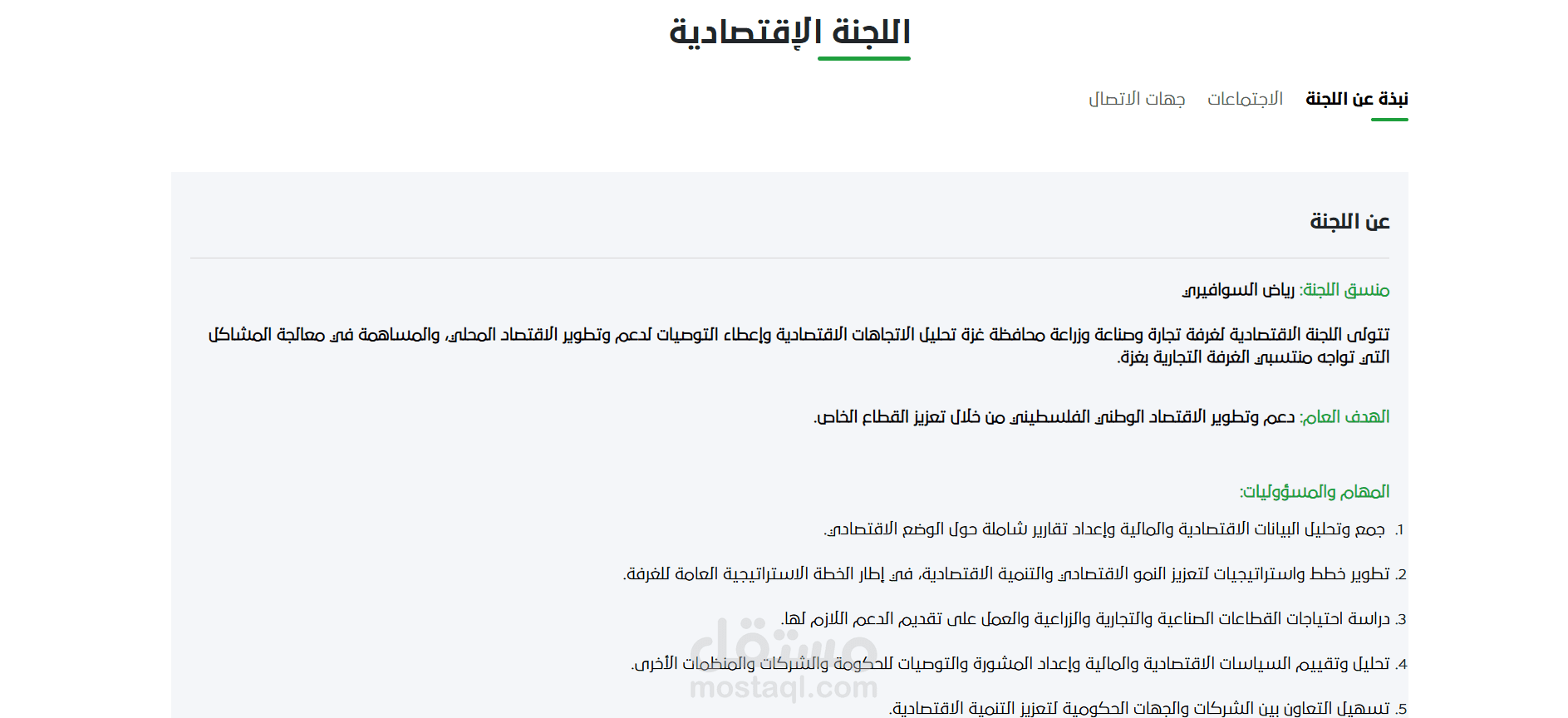 2. معلومات عن الغرفة : يضم معلومات عن غزة وعن الغرفة وعن مجلسها ورئيسها والقيم والأهداف وموارد المالية وغيرها.