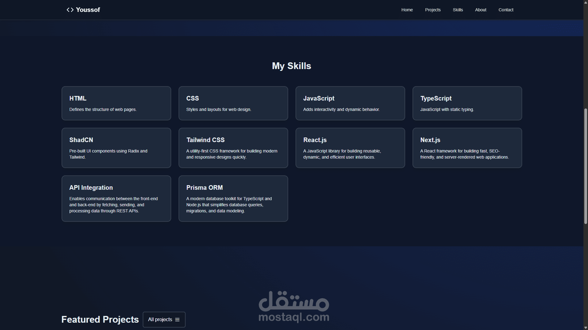 I developed a professional Portfolio Web Application using Next.js and TypeScript, powered by Prisma ORM and PostgreSQL as the database. The platform is designed to dynamically showcase personal information such as acquired skills and previous projects in an organized and structured way.