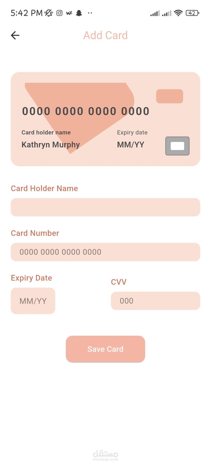 * **شاشات احترافية** لعرض بيانات البطاقة (Add Card, Payment Methods).