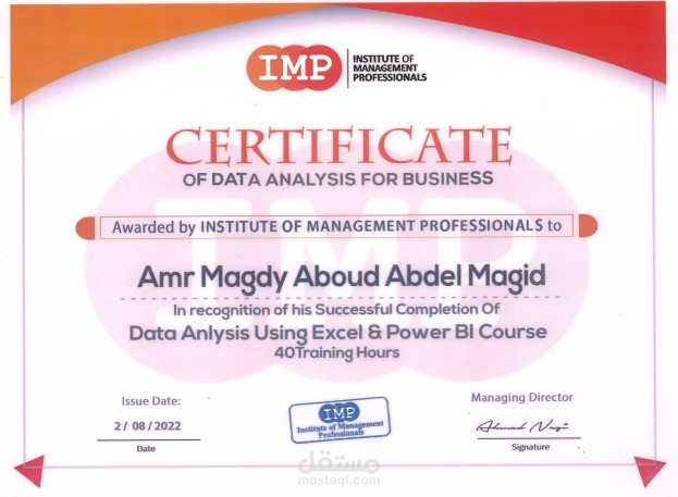 2️⃣ في عام 2022، قررت تطوير مهاراتي بشكل احترافي فالتحقت بدورة تحليل البيانات باستخدام Excel وPower BI من معهد المحترفين للإدارة (IMP)، وتدربت على إعداد النماذج التفاعلية وتحليل بيانات الأعمال.