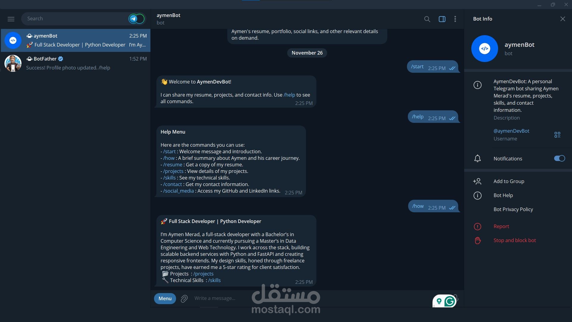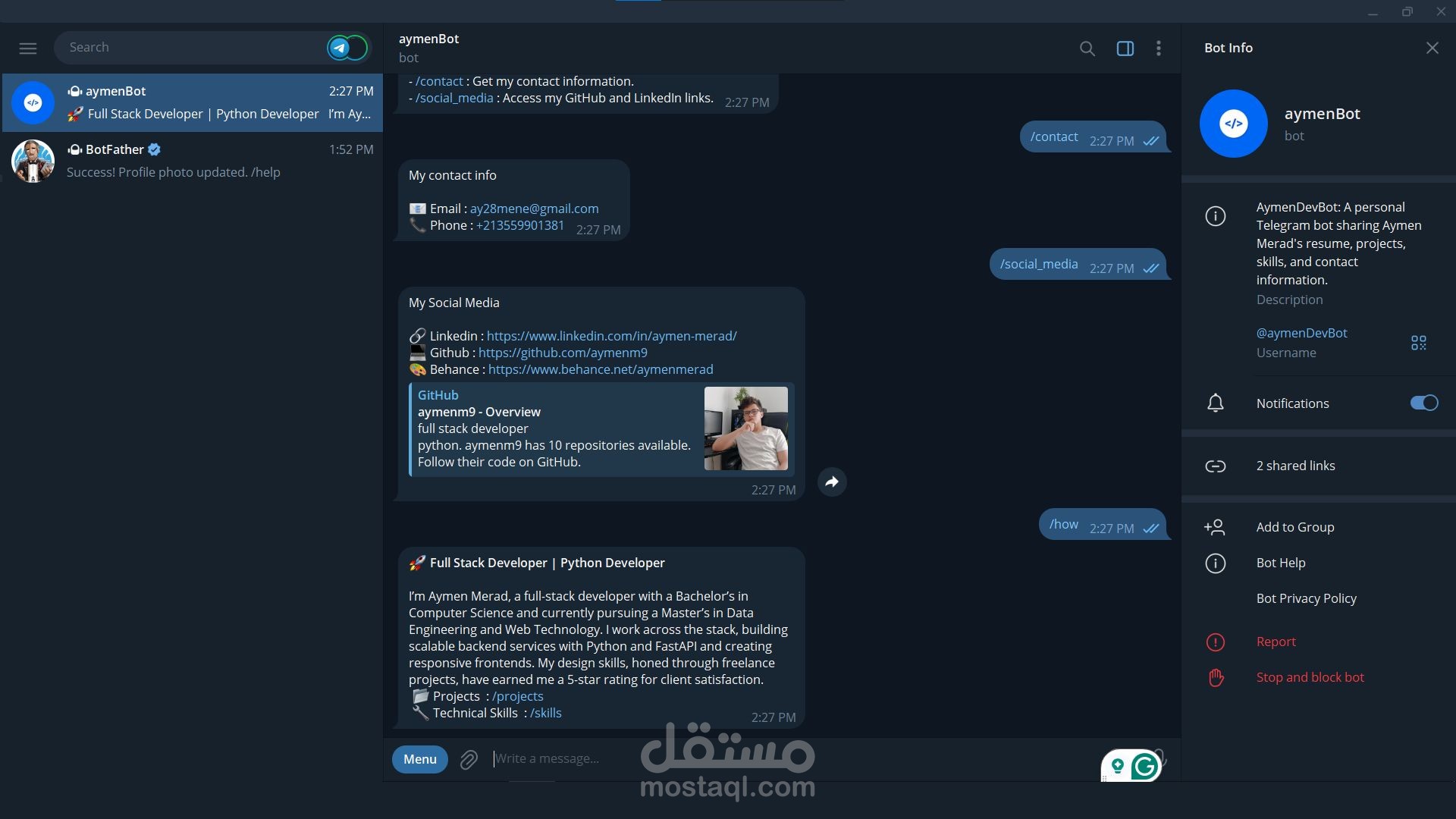 AymenDevBot هو بوت مفتوح المصدر على تيليجرام صُمم لعرض سيرتي الذاتية، ومشاريعي، ومهاراتي التقنية، وروابط حساباتي على وسائل التواصل الاجتماعي. يمكنك استخدام هذا البوت كمساعد شخصي أو تخصيصه حسب احتياجاتك الخاصة.