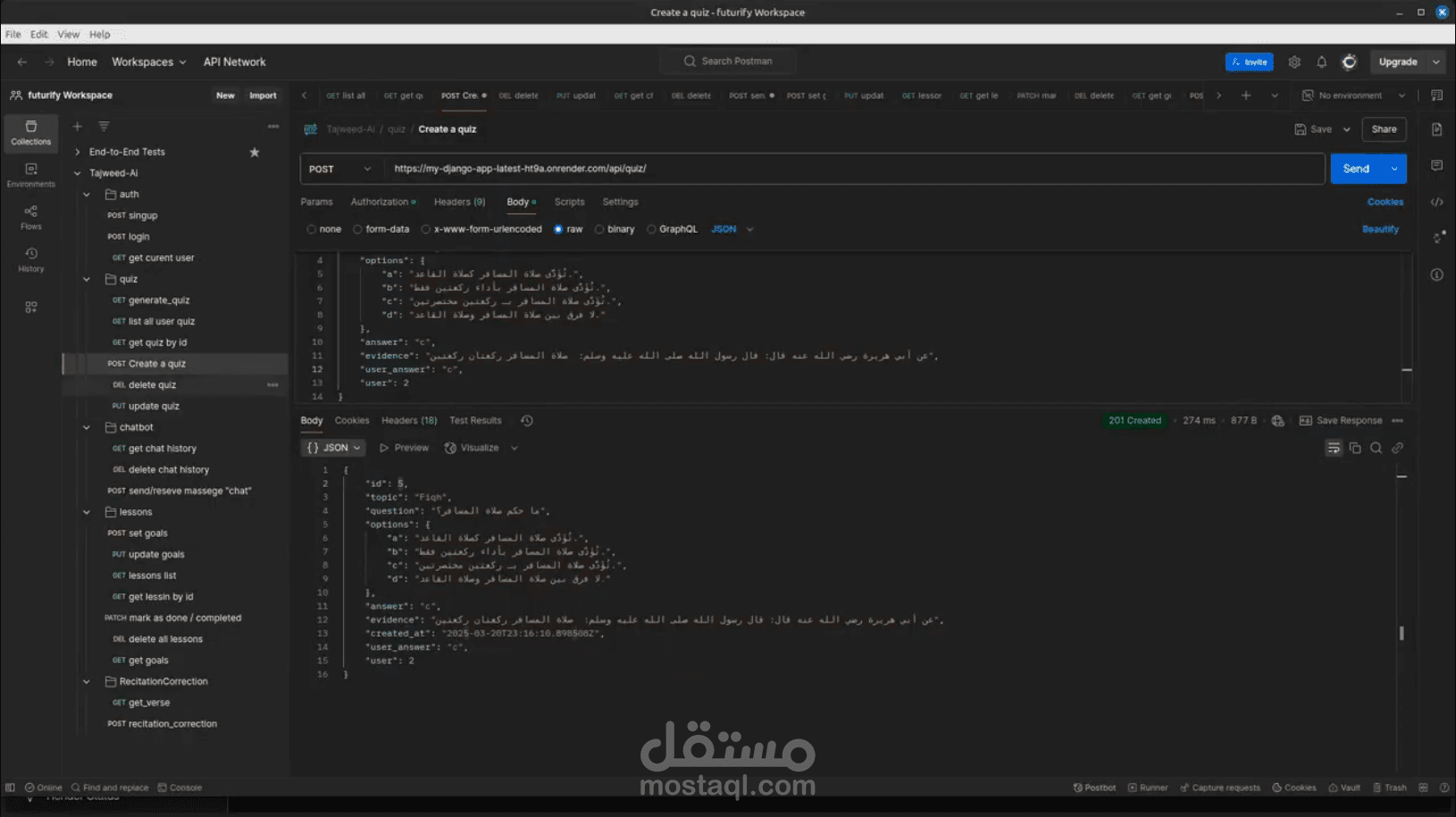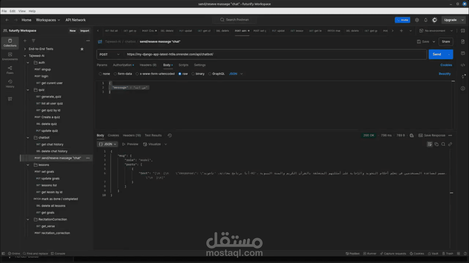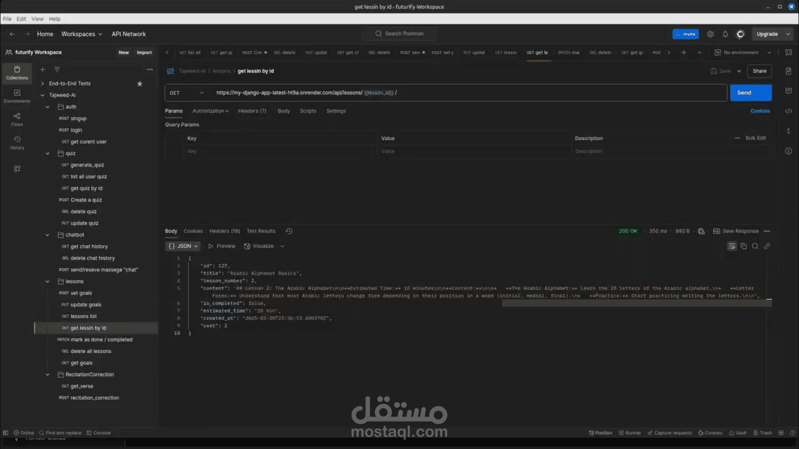 واجهة خلفية لتطبيق Tajweed-AI، تم تطويرها باستخدام Django REST Framework، لمساعدة المستخدمين في تعلم تلاوة القرآن وأحكام التجويد باستخدام محتوى مولَّد بالذكاء الاصطناعي. مستضاف على Render باستخدام Docker.