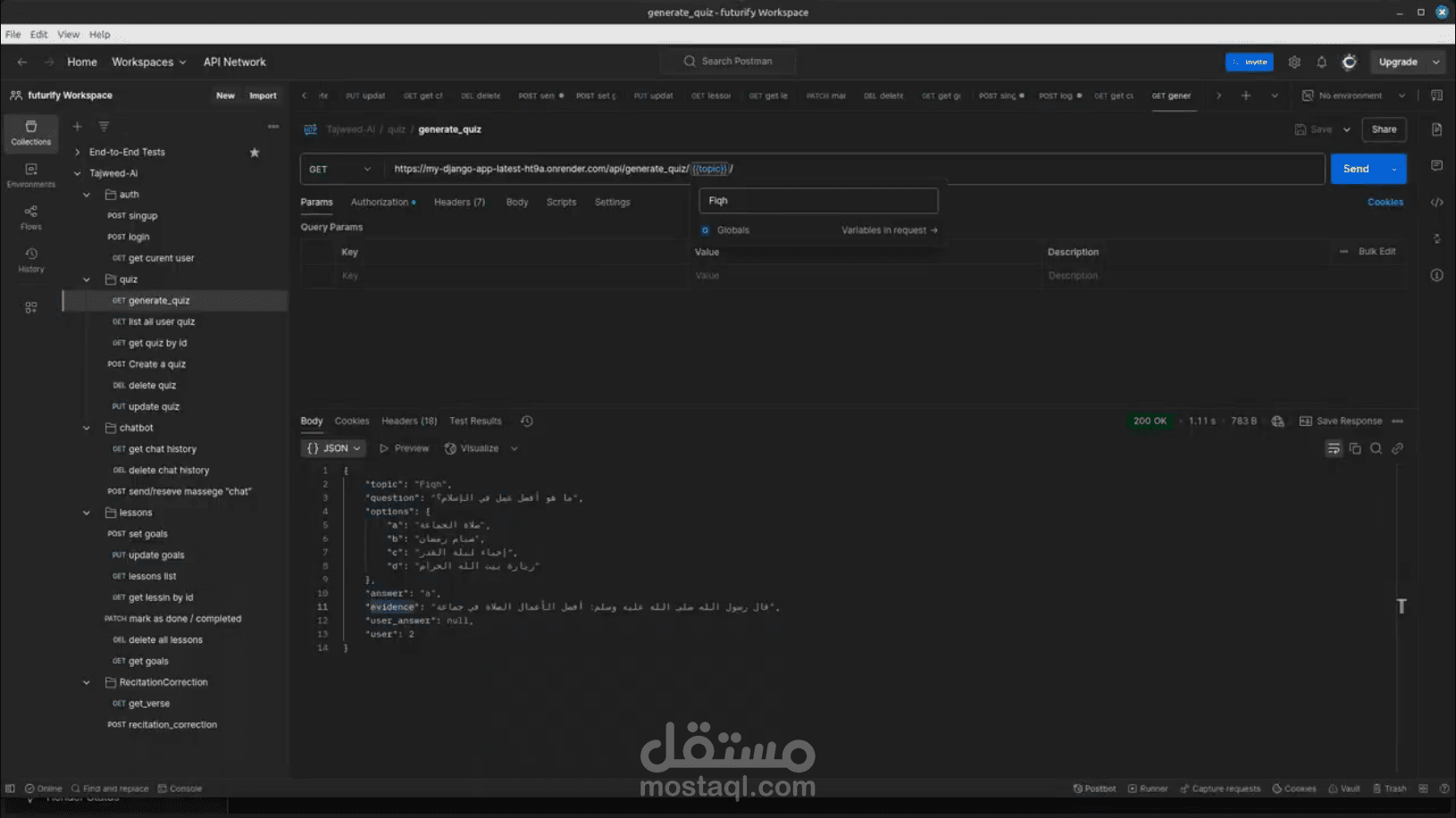 جميع الميزات المعتمدة على الذكاء الاصطناعي (توليد الاختبارات، روبوت المحادثة، إنشاء الدروس، تصحيح التلاوة) تستخدم Google Gemini API.