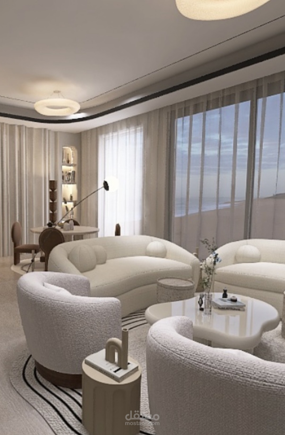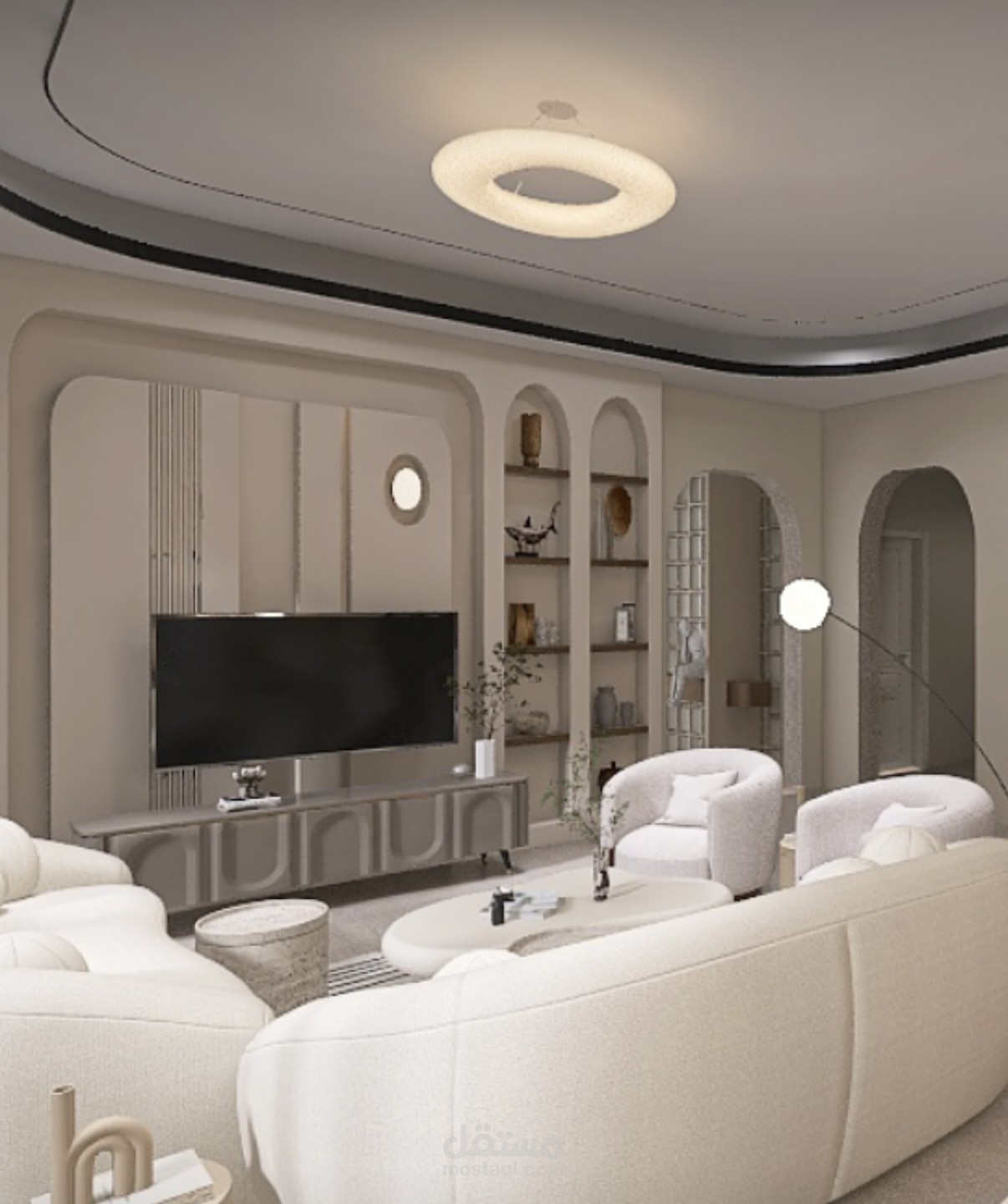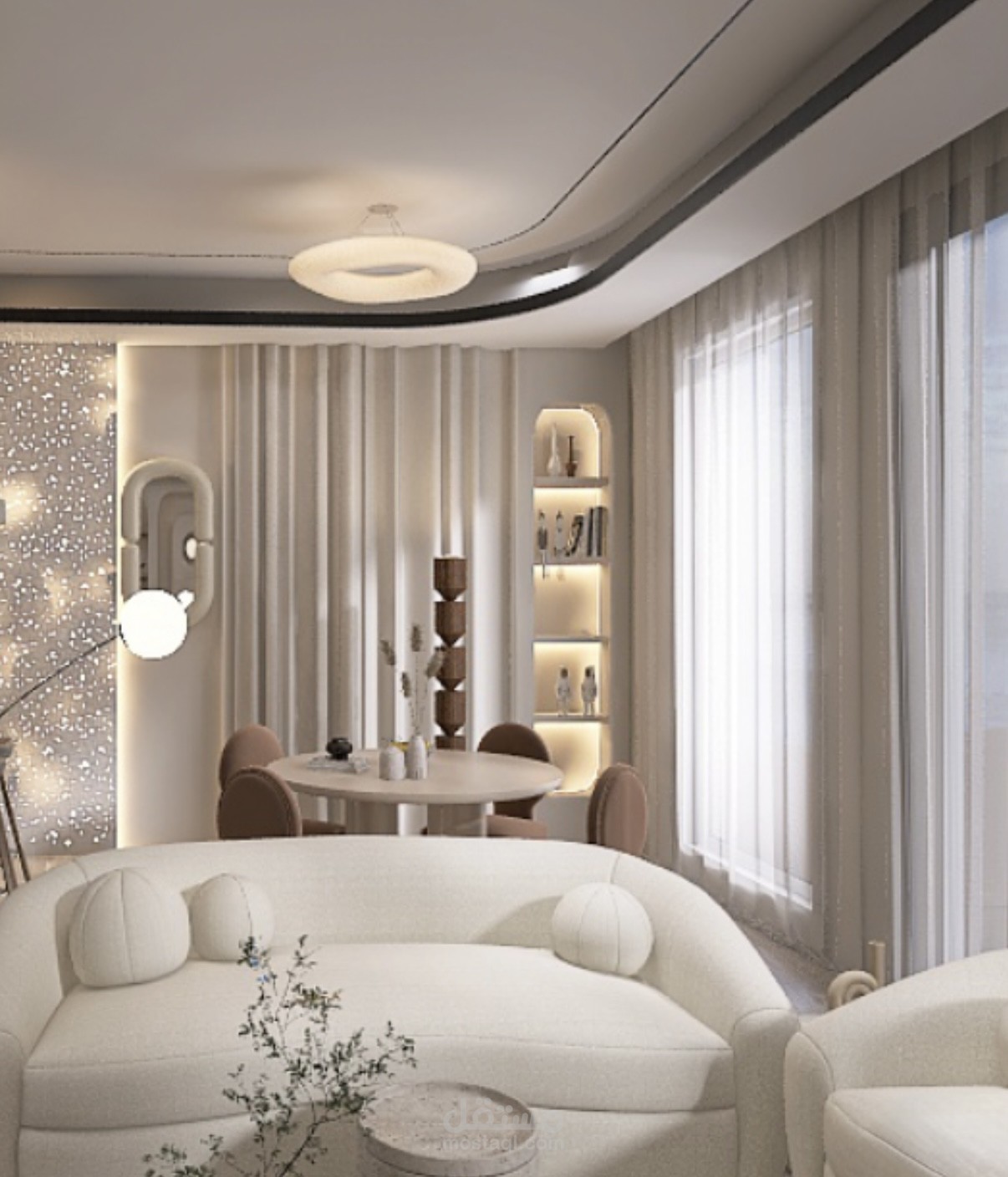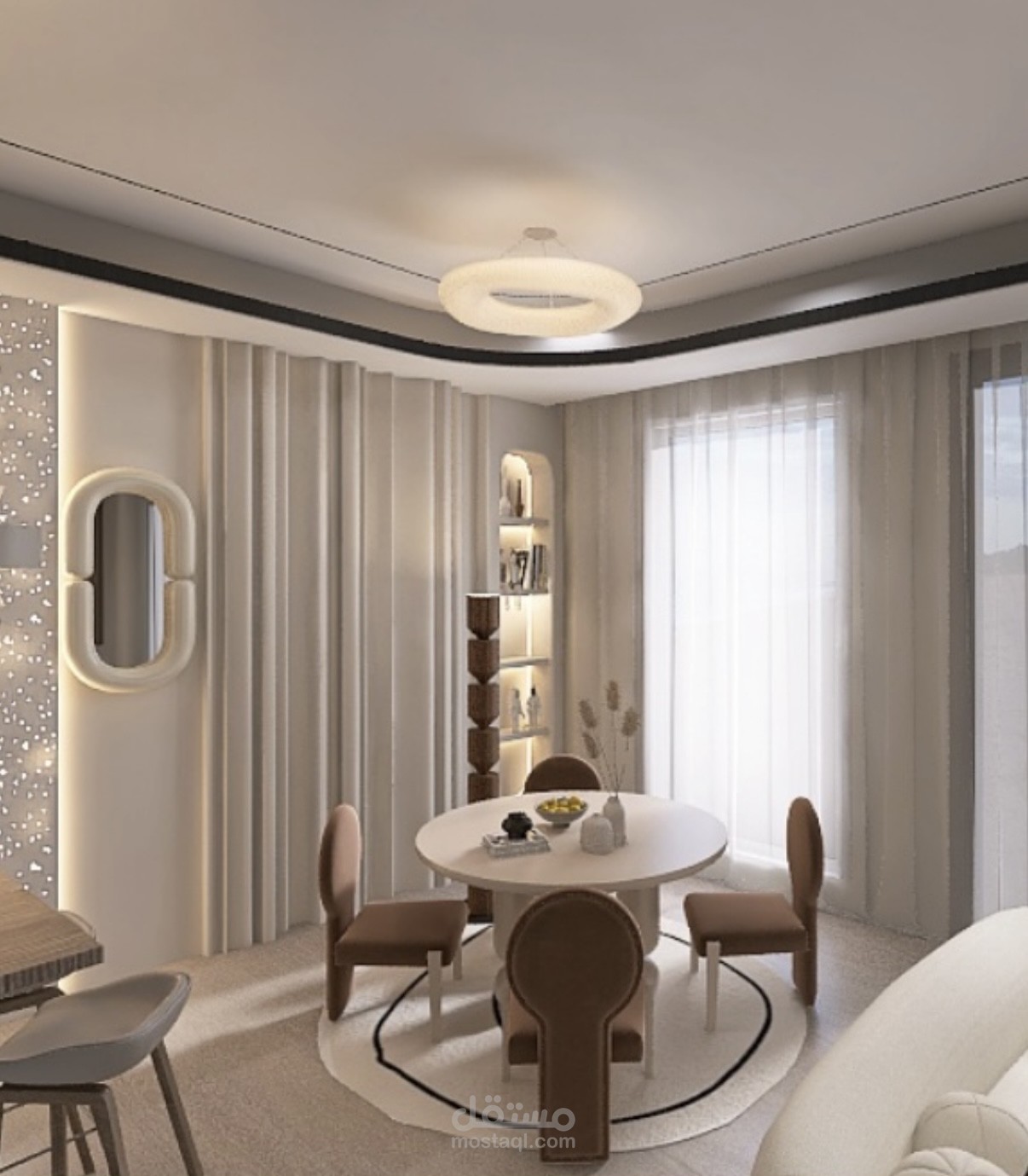 تصميم صاله عائليه ومطبخ وطاولة طعام