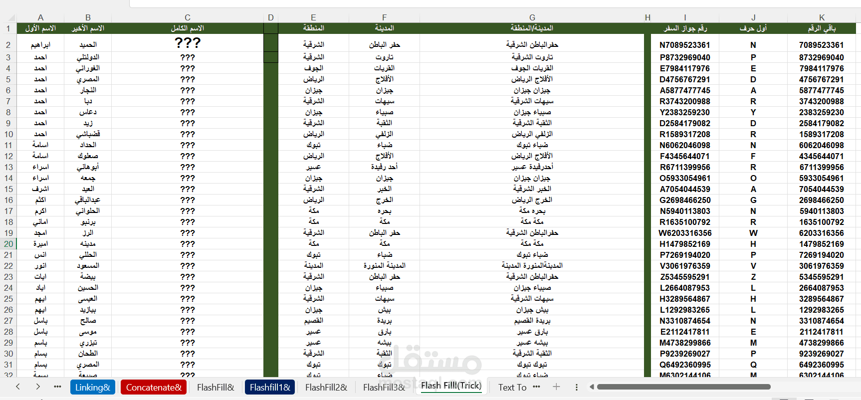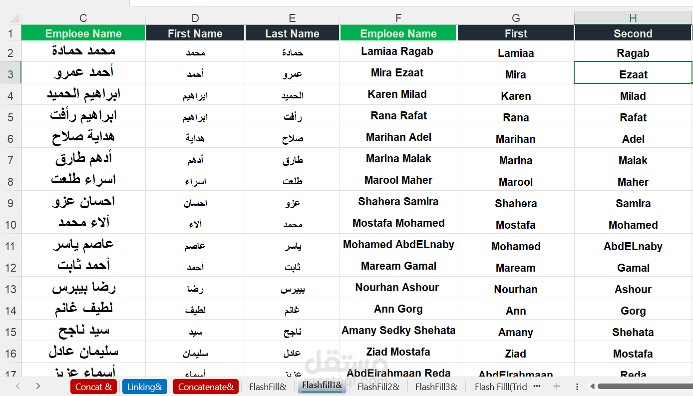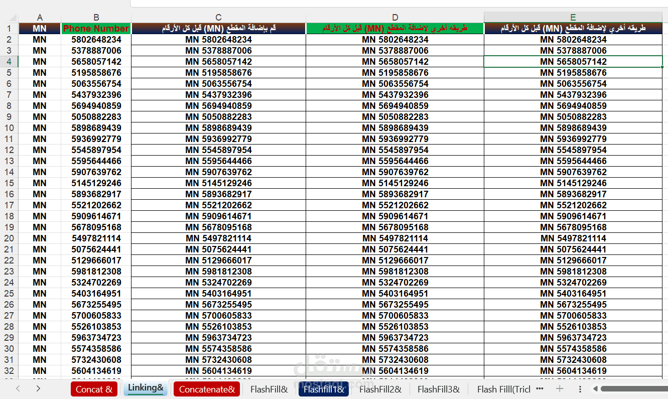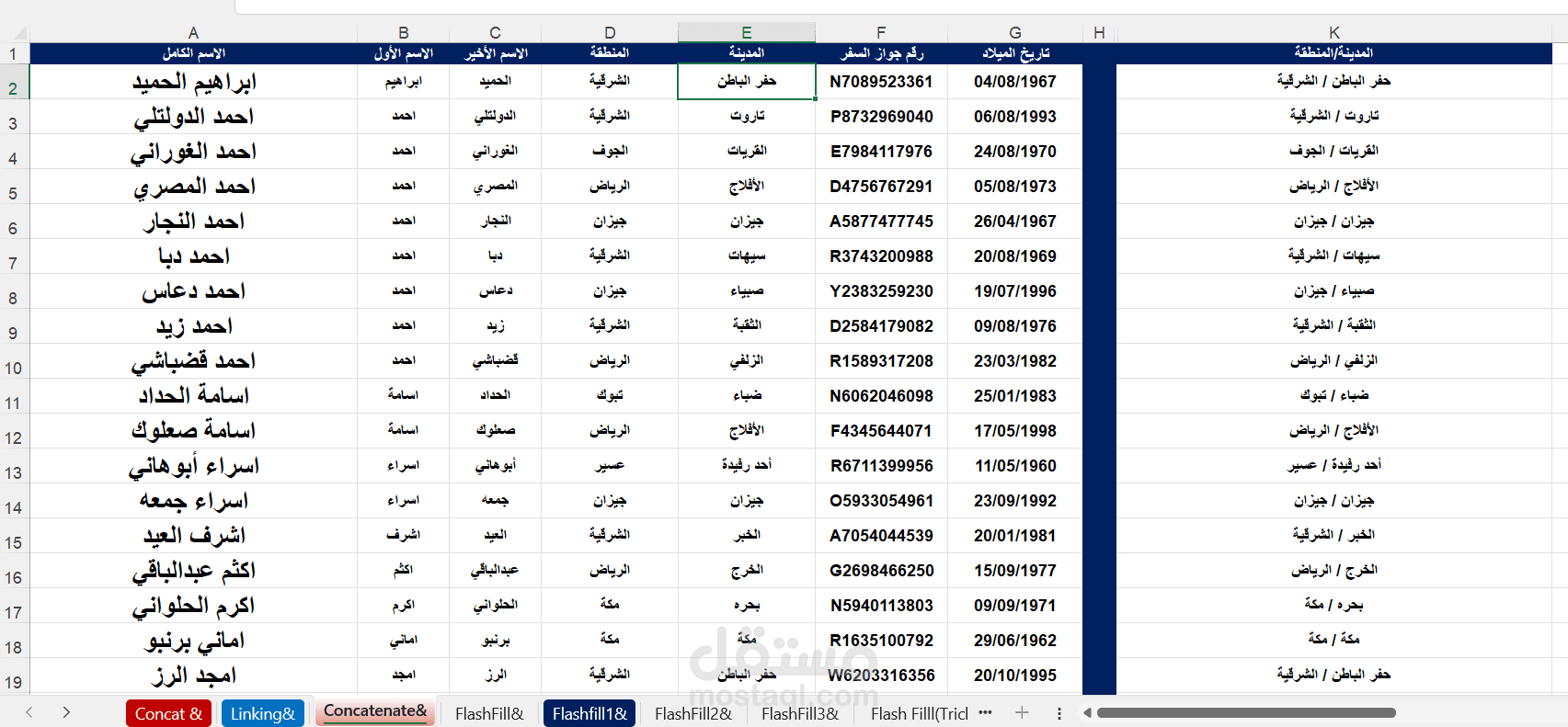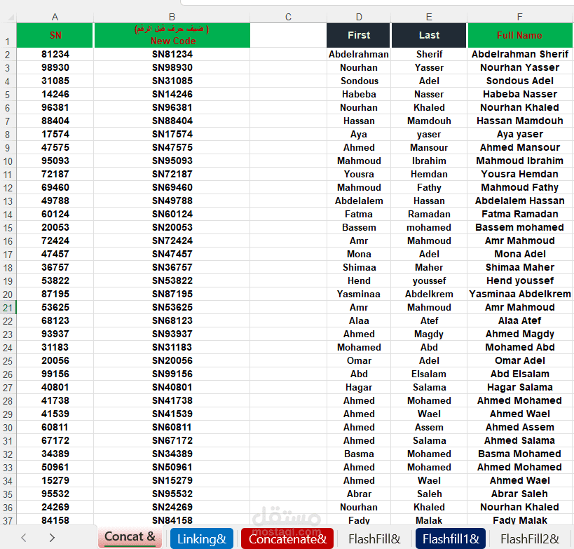في هذا الملف، قمت بتوظيف دوال Excel المتقدمة مثل CONCAT, CONCATENATE, وFLASH FILL لربط النصوص المختلفة بطريقة ديناميكية وفعالة.