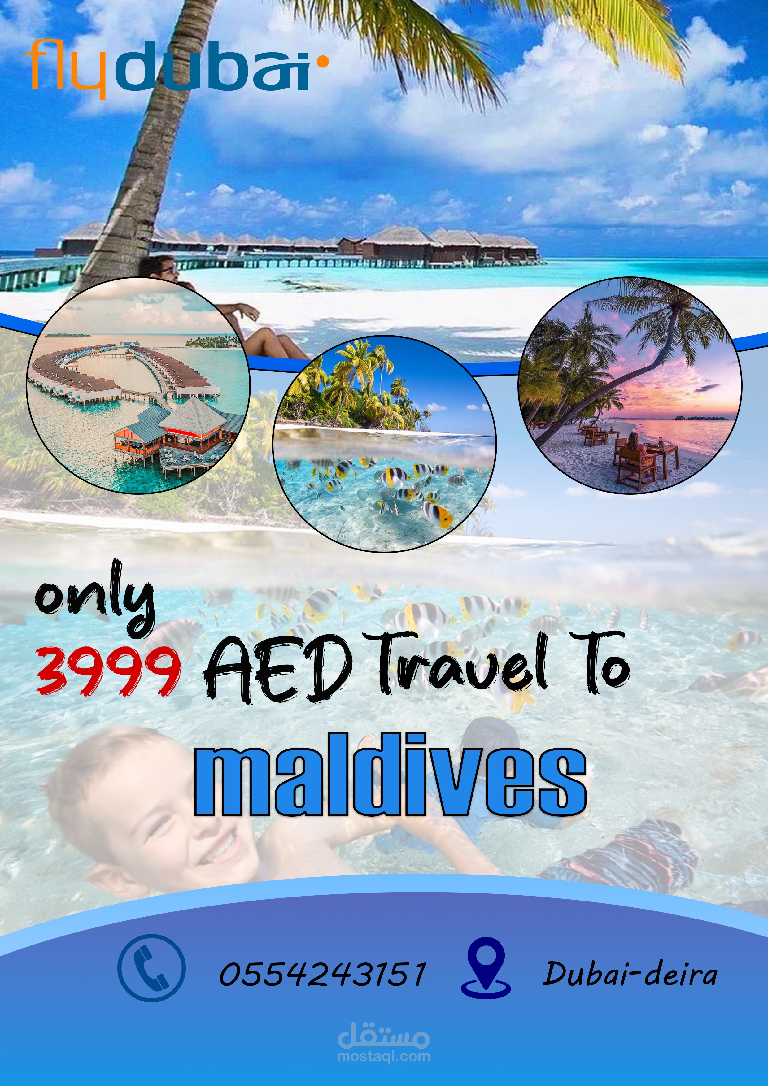 تم تصميم هذا الإعلان اعتمادا على عناصر رئيسية ( صور جذابة من المالديف , سعر التذكرة بلون مميز لجذب اللإنتباه , موكاب مميز )