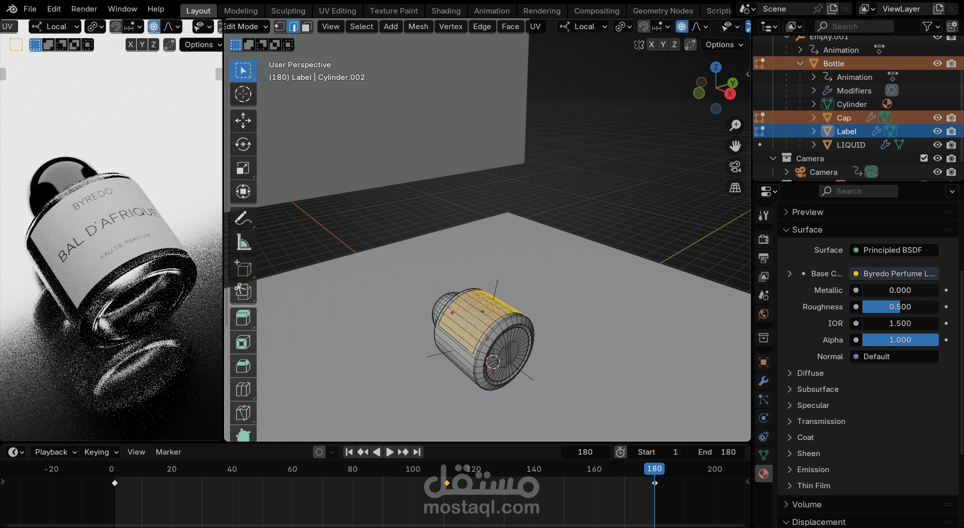 تمت النمذجة من الصفر باستخدام أدوات احترافية في Blender، مع مراعاة الخطوط الانسيابية للزجاجة وشكل الغطاء الأيقوني الأسود.