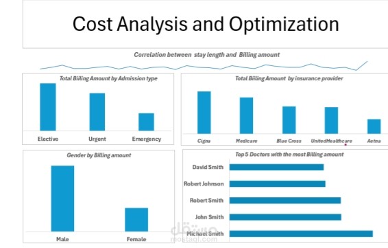 قمت بتصميم لوحة معلومات (Dashboard) تحليلية لقطاع الرعاية الصحية بهدف تتبع التكاليف وتحسين اتخاذ القرارات. تعرض اللوحة تحليلًا شاملاً لفواتير العلاج بحسب نوع الدخول، مزوّدي التأمين، النوع، والأطباء الأكثر إصدارًا للفواتير، مع تضمين تحليل الارتباط بين مدة الإقامة والمبالغ المحاسبية.
