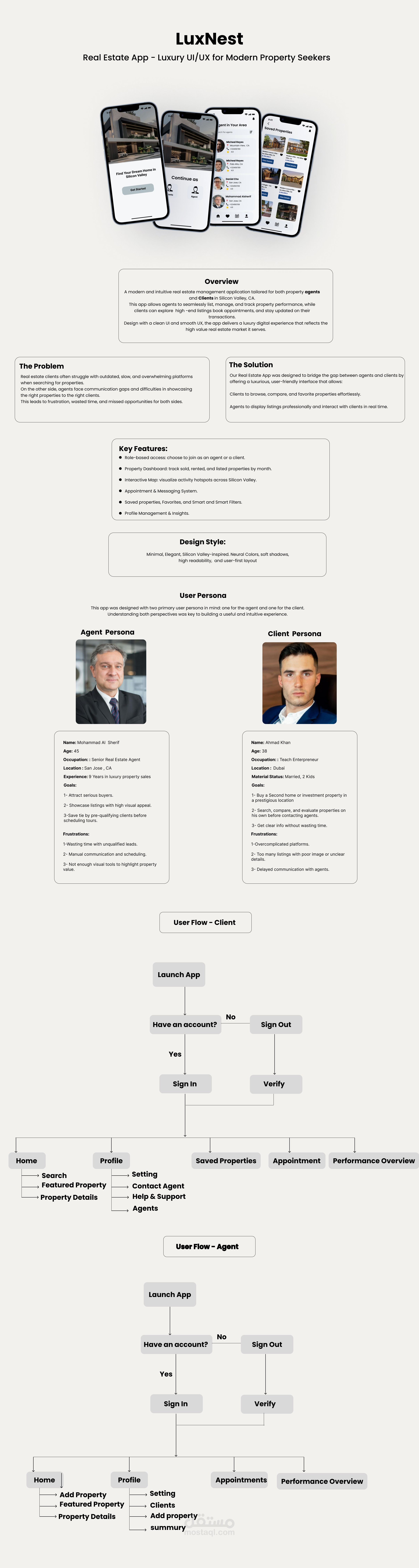 Lux Nest هو تطبيق عقاري مصمم بأسلوب فخم يلبي احتياجات كل من العملاء الباحثين عن منازل راقية، ووكلاء العقارات الذين يعرضون تلك العقارات. يقدّم التطبيق تجربة مستخدم أنيقة وسلسة تساعد على تسهيل عملية استكشاف وشراء العقارات الفاخرة.