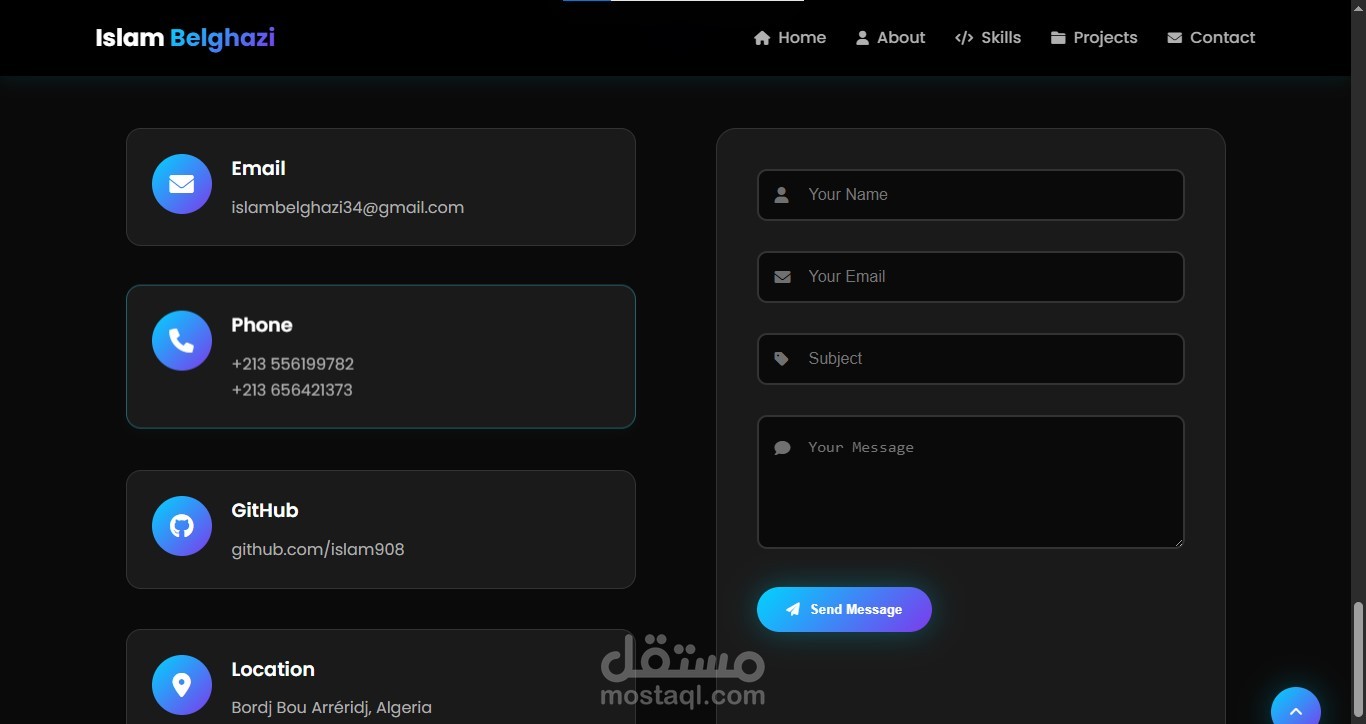 قمت بتطوير موقع بورتفوليو شخصي يعرّف بي وبأعمالي كمطوّر ويب ومبرمج تطبيقات. الموقع مصمم باستخدام HTML، CSS، وJavaScript، مع تنظيم احترافي وسلس يركز على تجربة المستخدم.