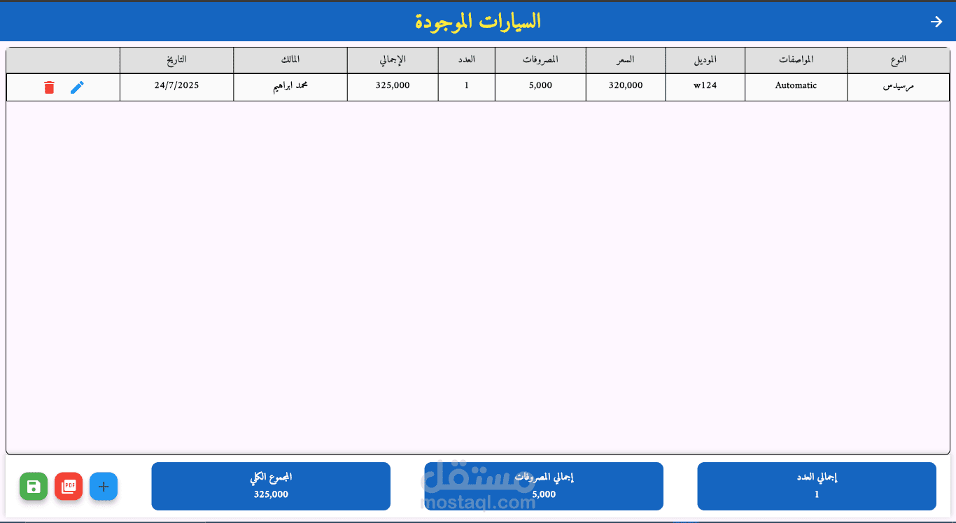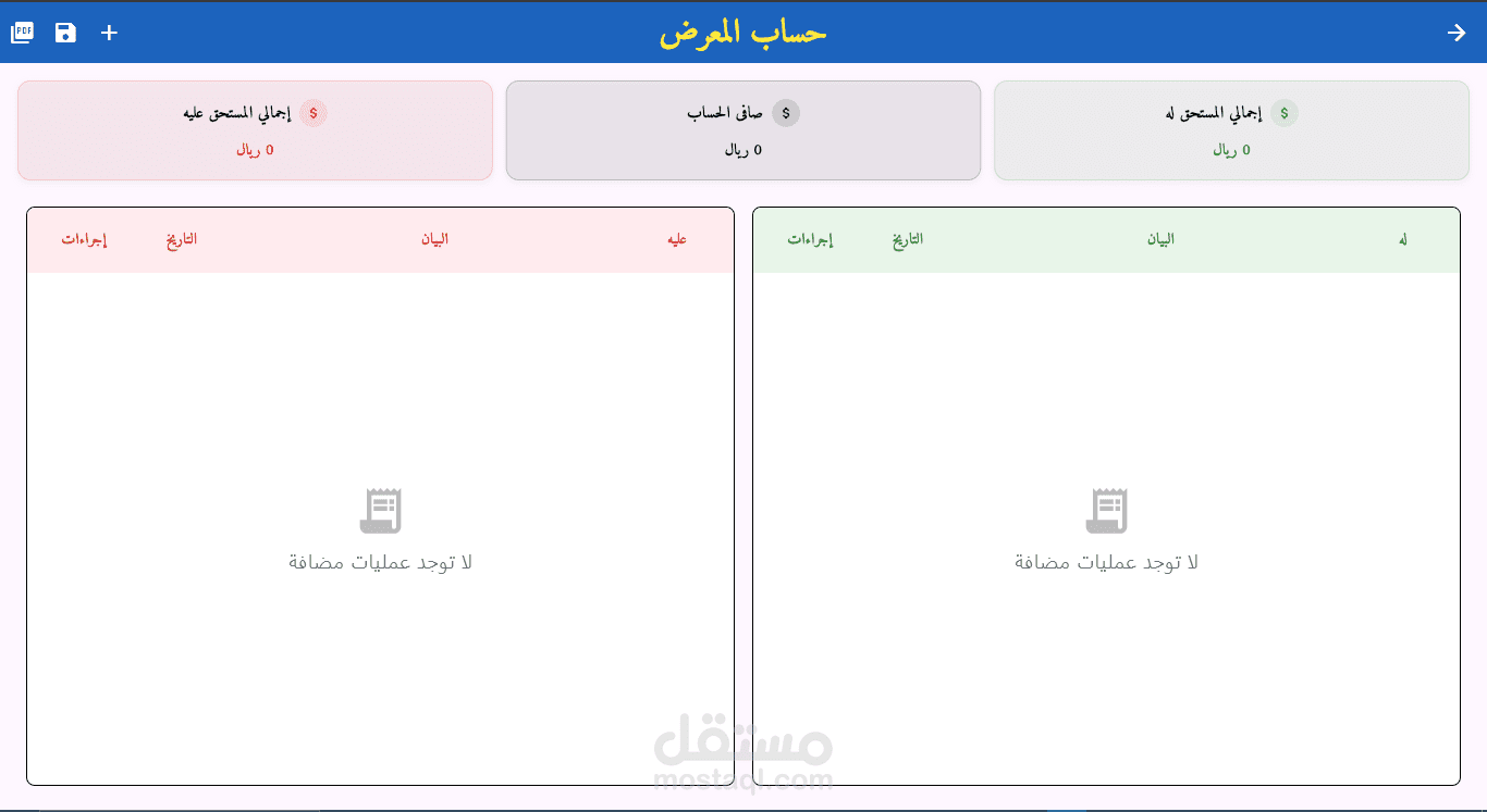 صفحة حساب المعرض لمعرفة الداخل و الخارج من والى الخزنة ومعرفة الصافى.