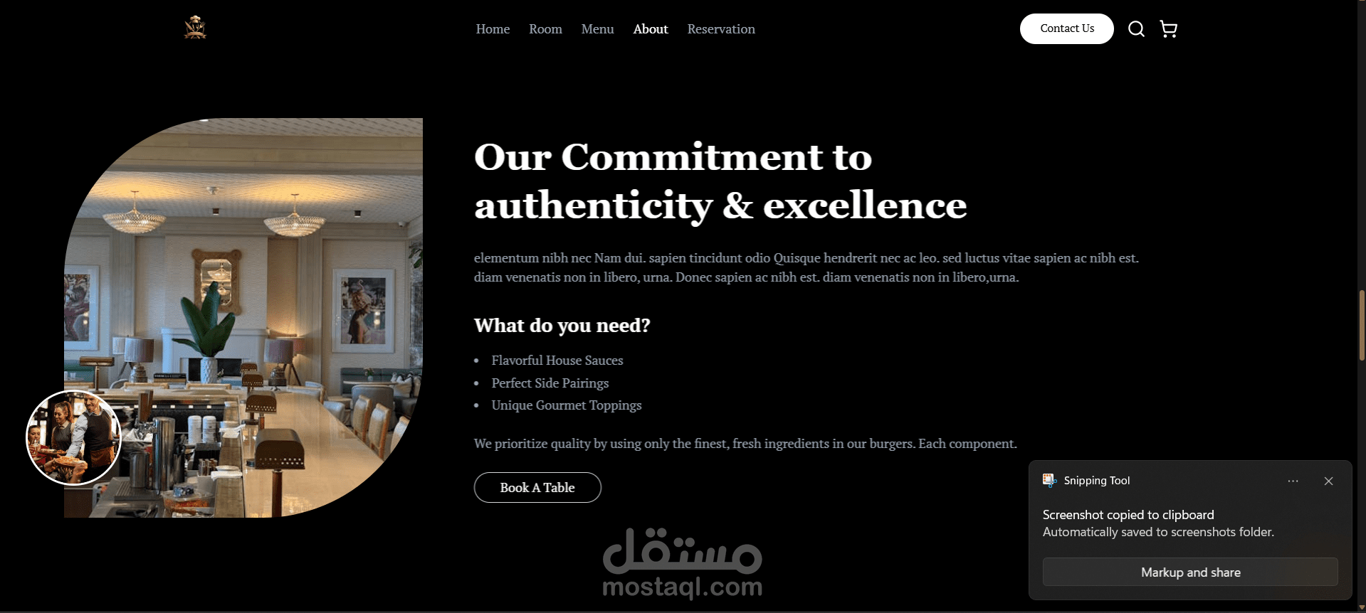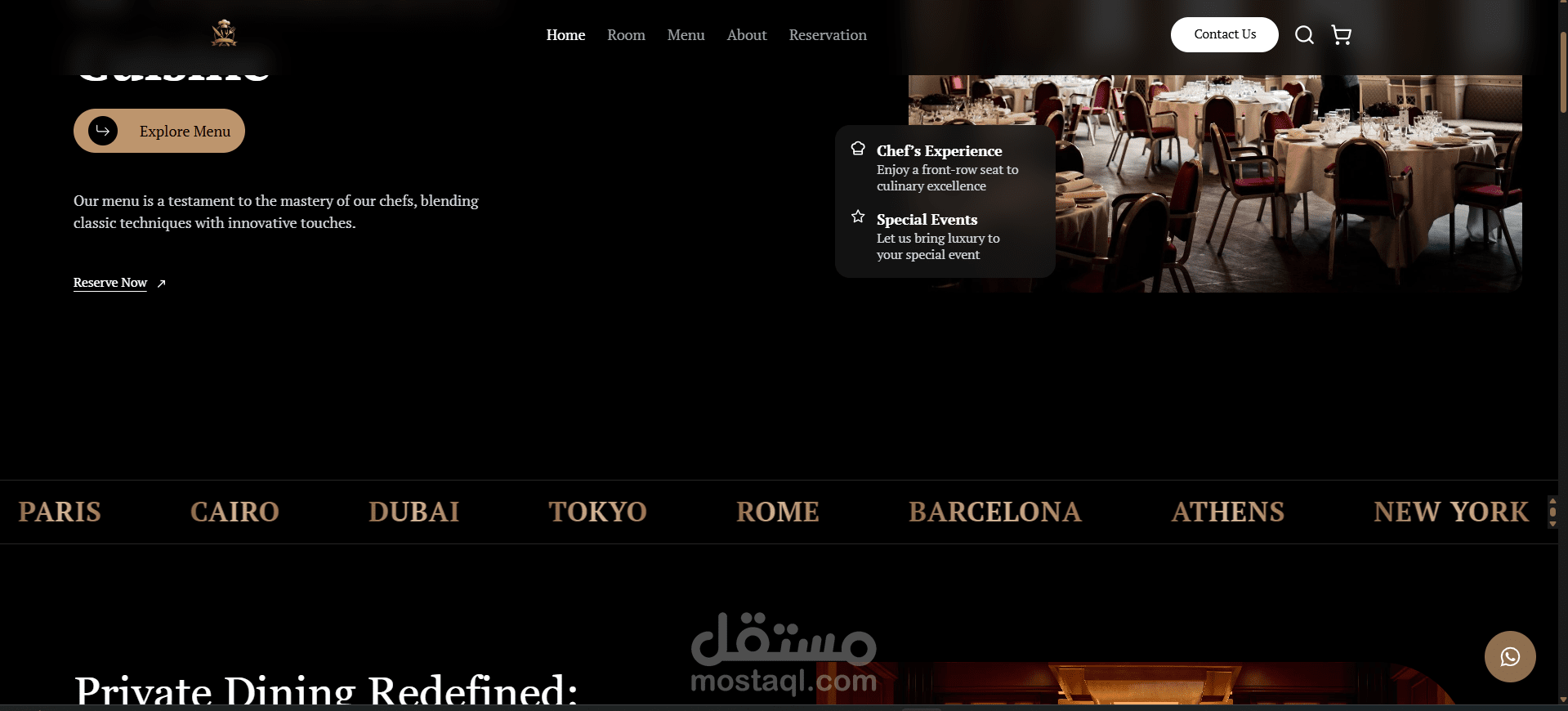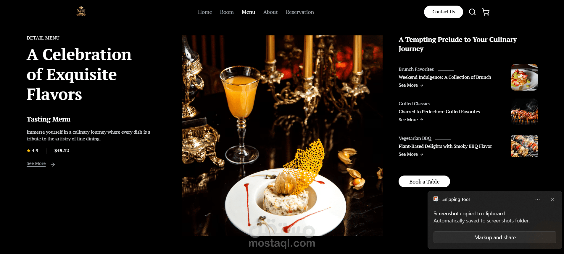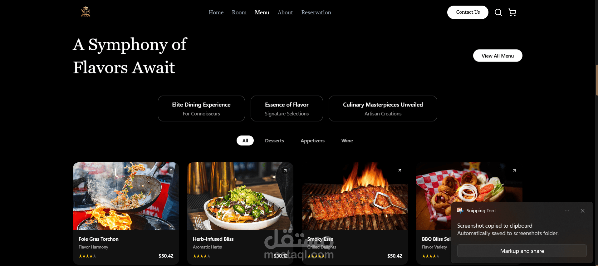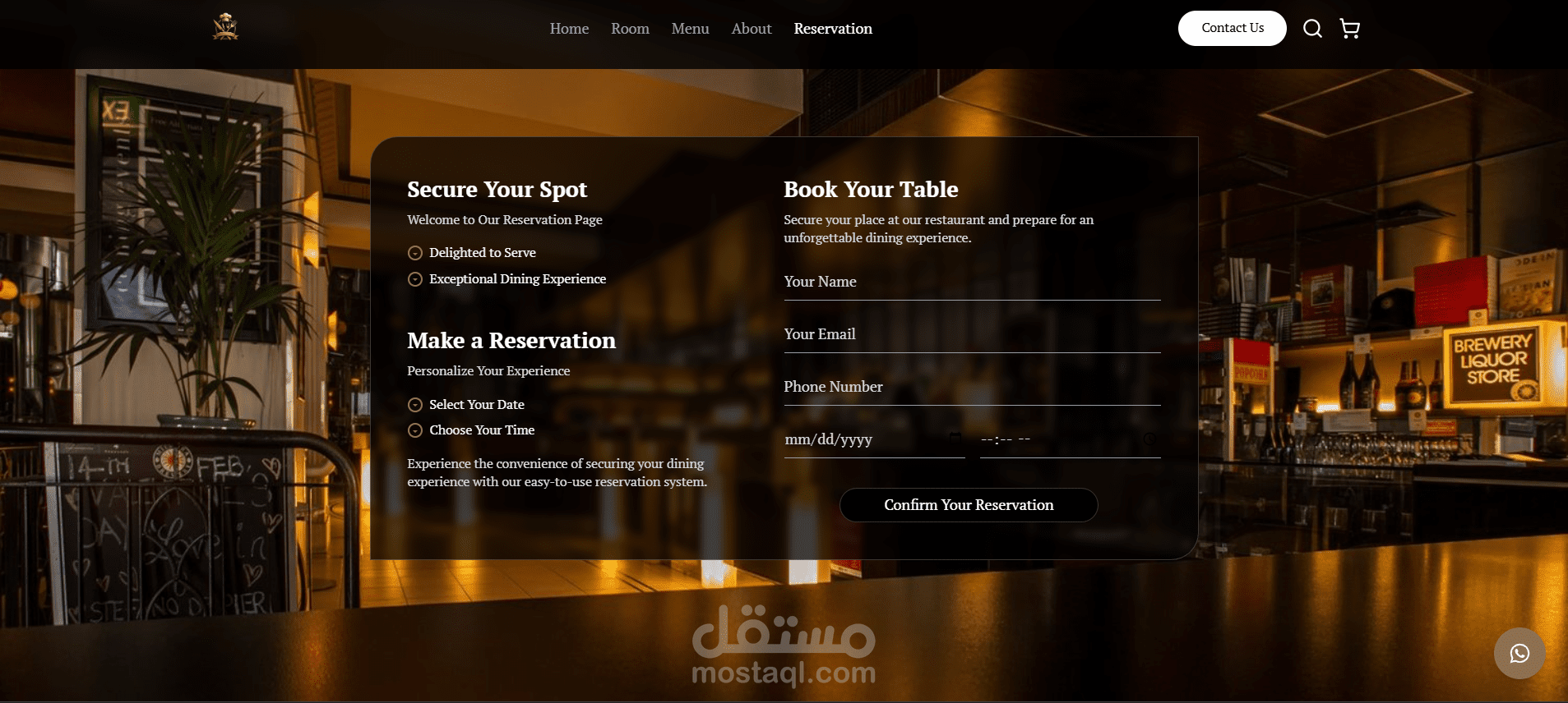 في هذا المشروع، قمت ببناء موقع إلكتروني عصري لمطعم راقٍ، يعكس الهوية البصرية للمطعم ويوفر تجربة استخدام سلسة وجذابة.