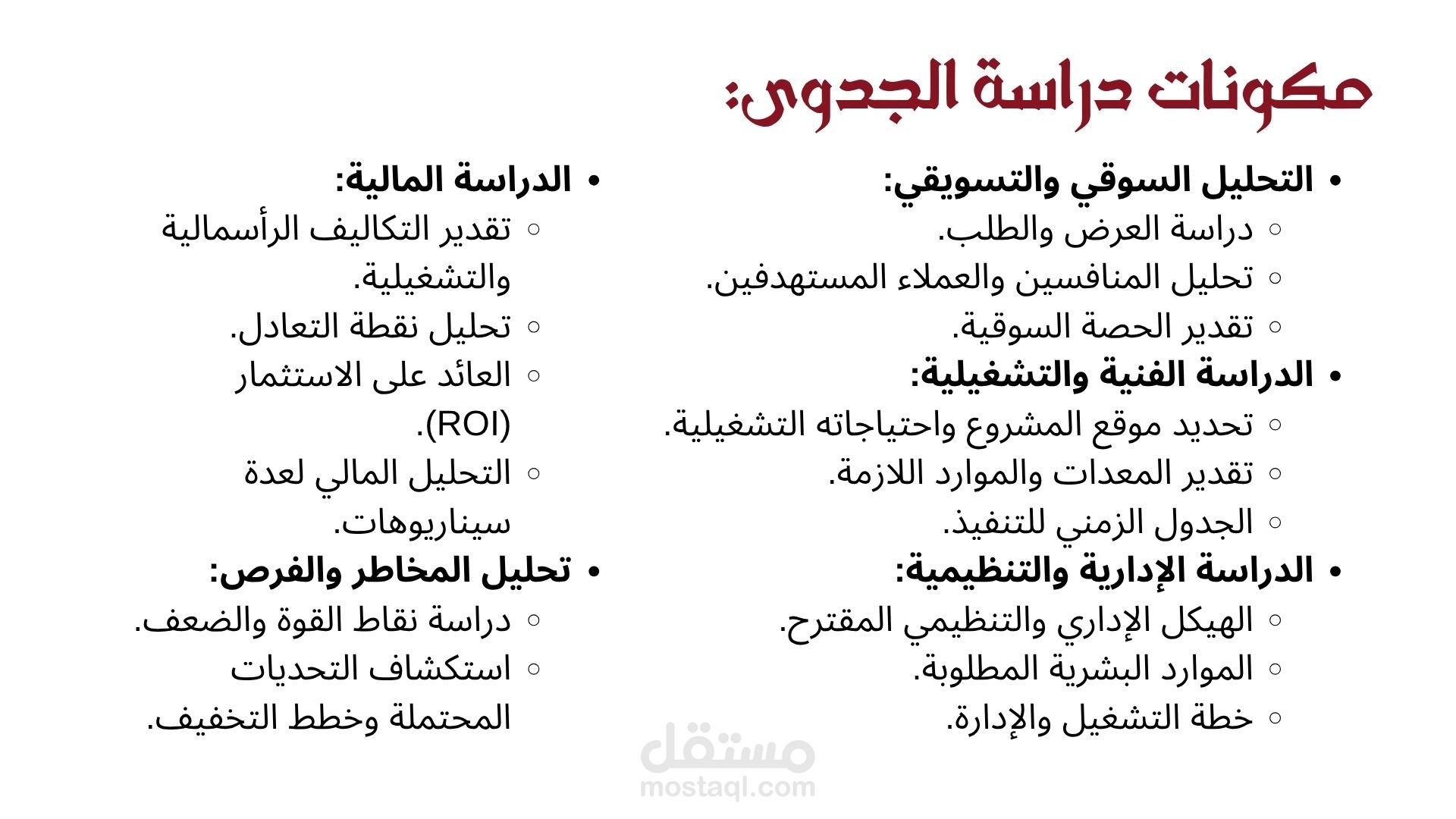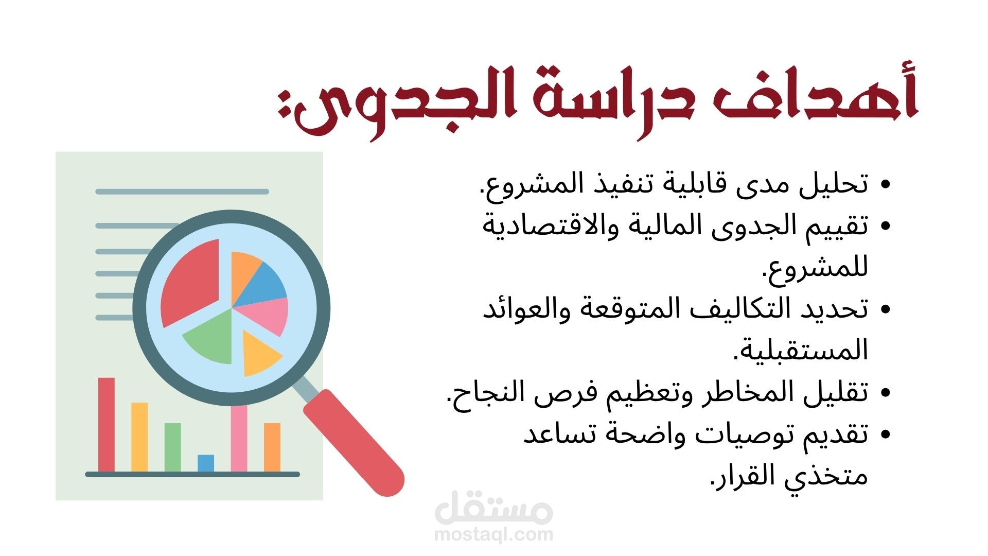 دراسة جدوى متكاملة ومُعدّة باحترافية عالية، مصممة خصيصًا لتناسب طبيعة مشروعك وسوقك المستهدف. تشمل دراستنا تحليلًا دقيقًا للسوق والطلب والمنافسين، وتحديدًا واضحًا للفرص المتاحة، بالإضافة إلى دراسة فنية تُعنى بتحديد التكاليف التشغيلية، الموارد البشرية، المعدات، والخطة الزمنية للتنفيذ. كما نقدم لك تحليلًا ماليًا مفصلًا يغطي التكاليف الرأسمالية، الإيرادات المتوقعة، صافي الأرباح، ونقطة التعادل، مع نماذج وسيناريوهات مالية واقعية تساعدك على اتخاذ قرار استثماري سليم.