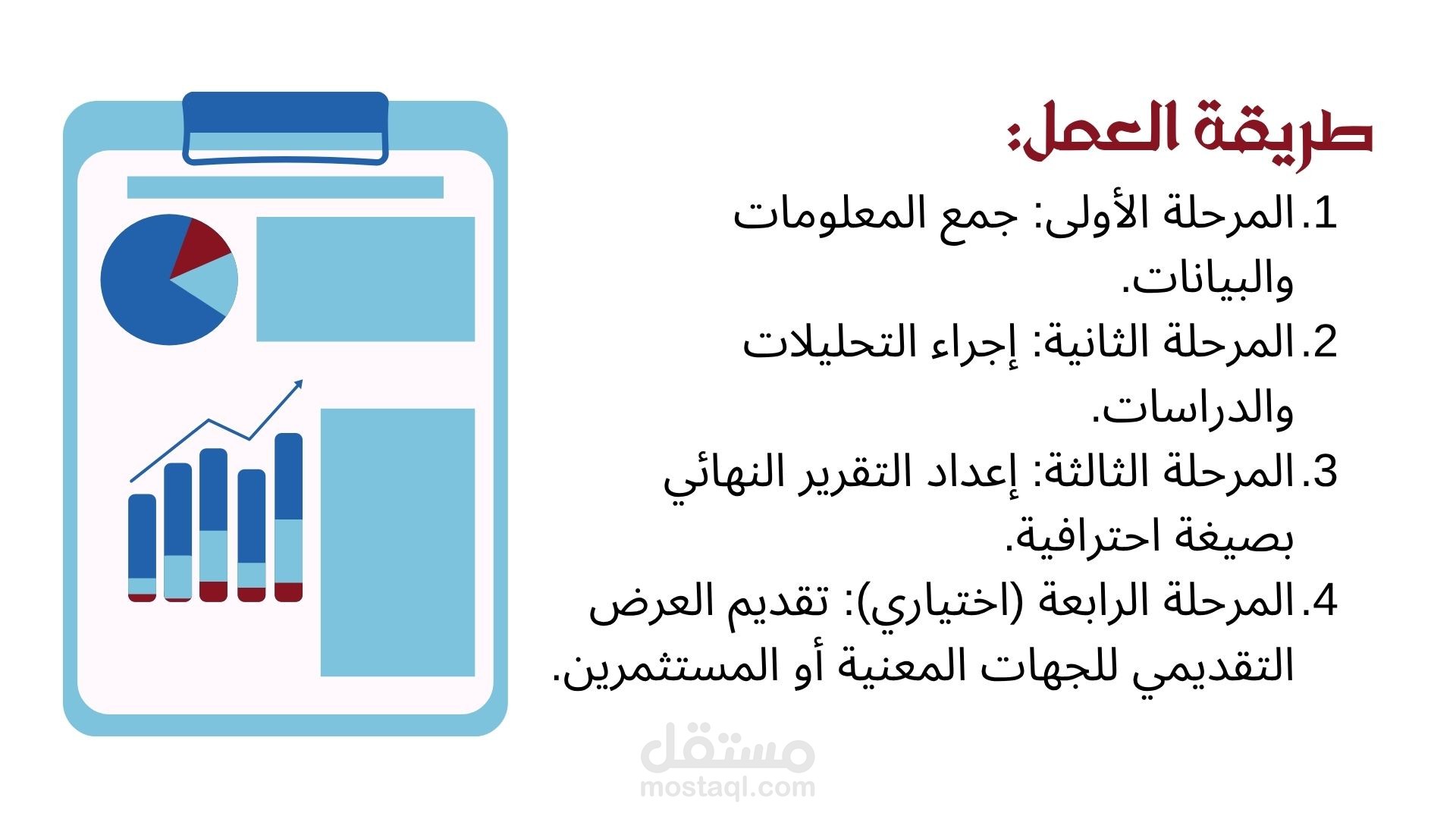 خارطة طريق واقعية للمشروع مدعومة بتحليلات واستراتيجيات، مع توصيات عملية مدروسة وخطة تشغيل قابلة للتنفيذ. سواء كنت تتجه نحو إطلاق مشروع ناشئ، أو تسعى للحصول على تمويل أو دعم من جهة حكومية أو استثمارية، فإن دراستنا ستكون أداة قوية بيدك تُظهر جاهزيتك واحترافك.