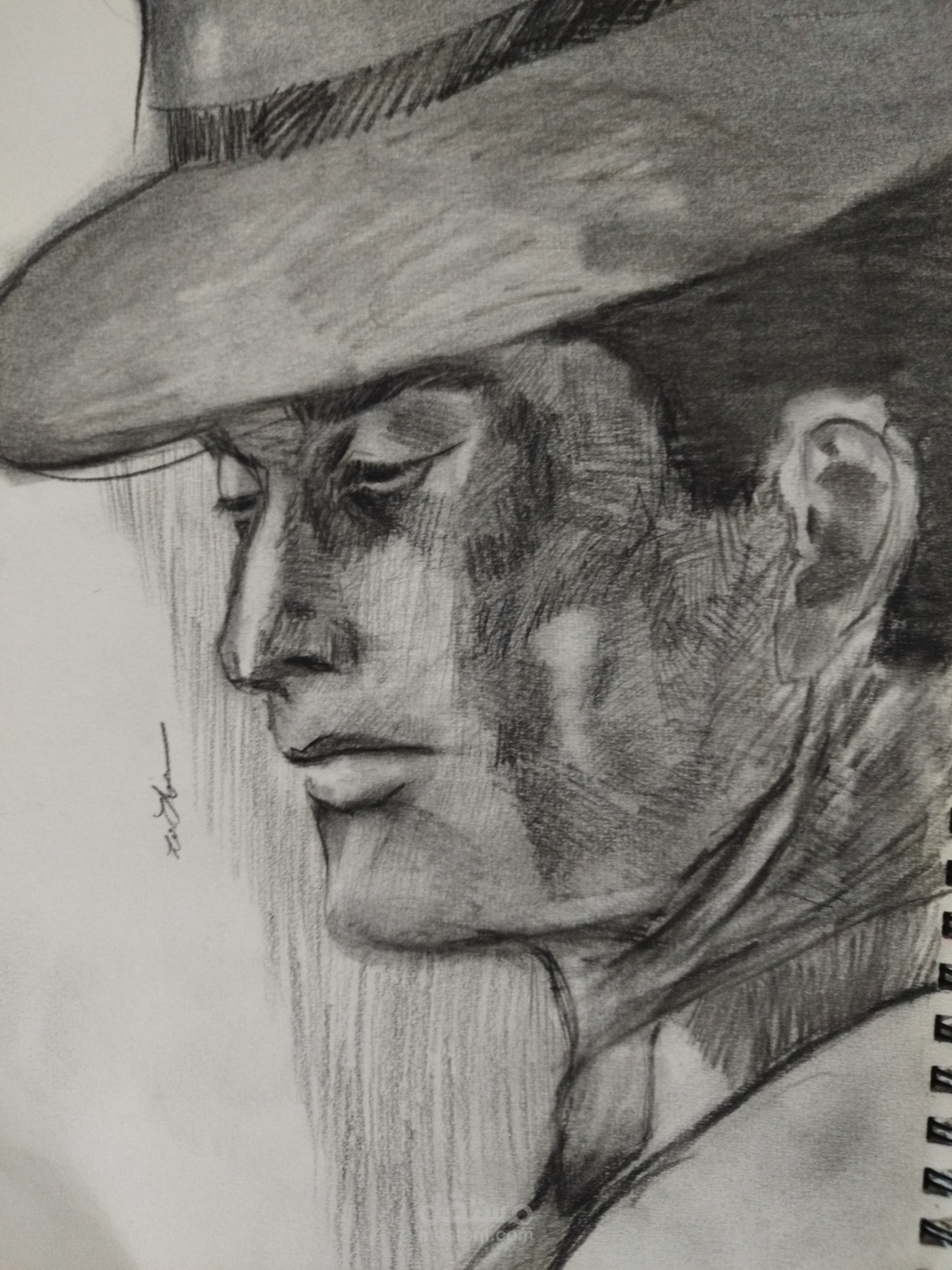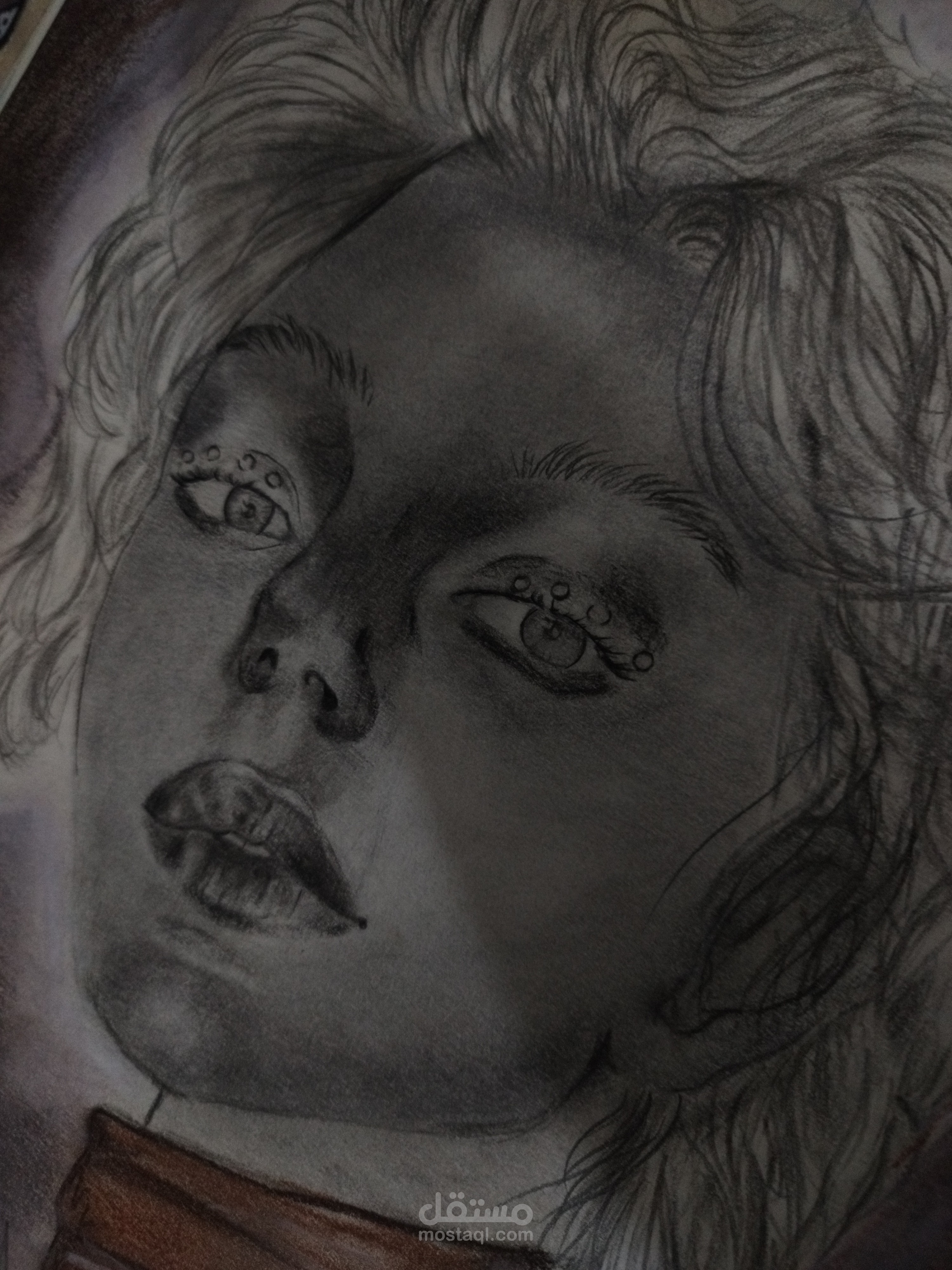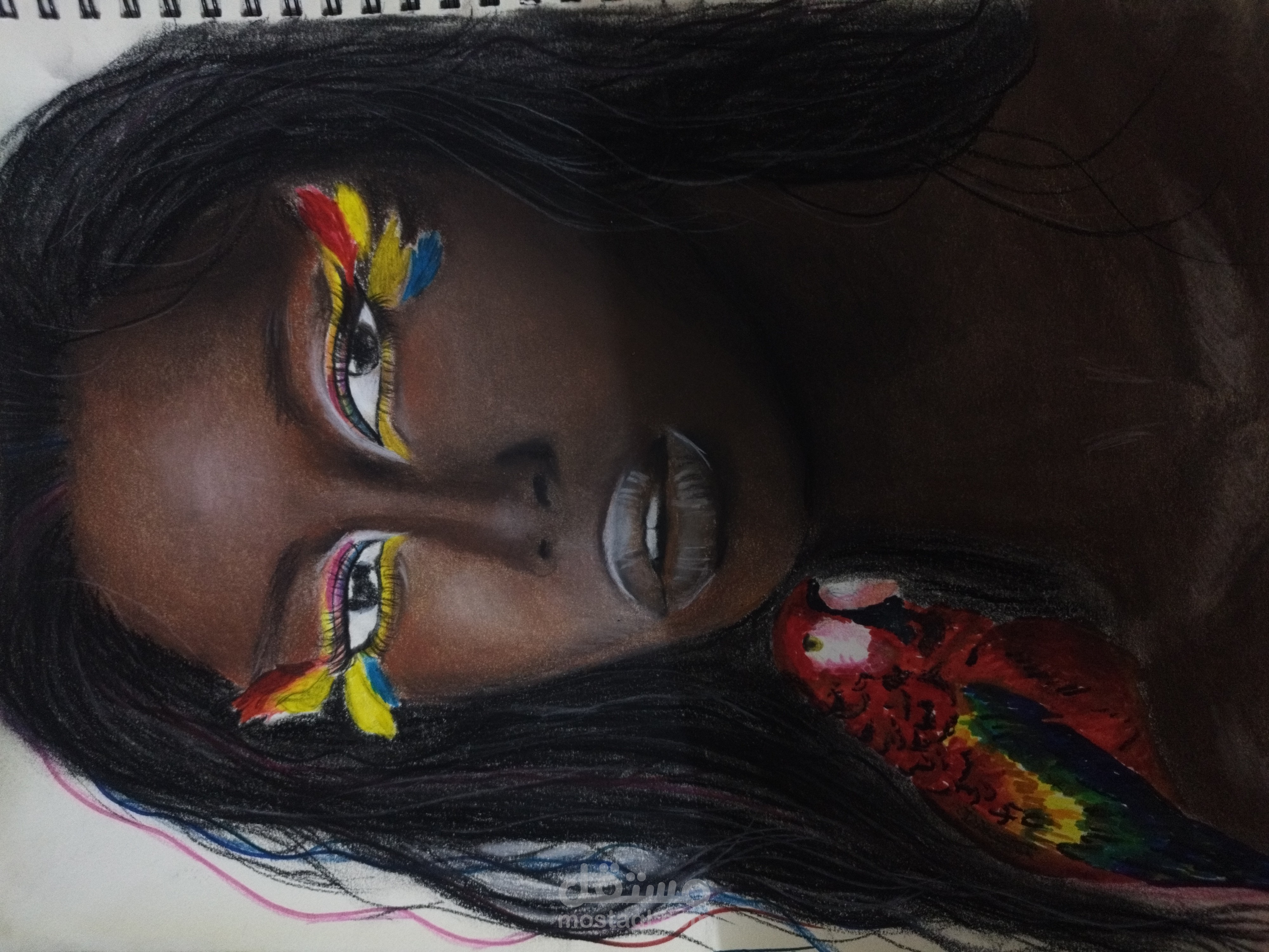 أنجزت هذه الرسمه بأسلوبي الخاص باستخدام اقلام الفحم مع التركيز على تعابير الوجه وتناسق الالوان واستخدام الخطوط الملونه والتركيز في الظلال استغرق العمل يومين.